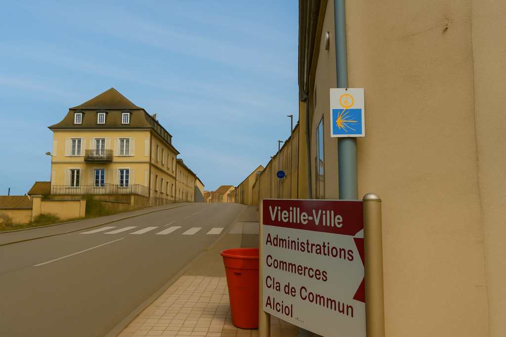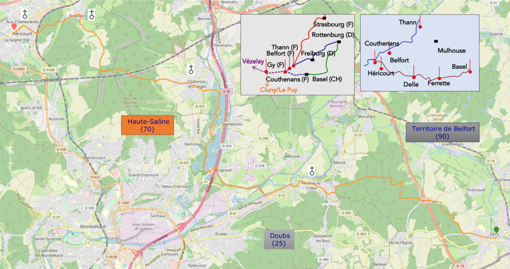 Delle est une cité aux multiples visages, éclatée en quartiers disparates, qui portent les marques des époques successives : bourgs anciens, cœurs ouvriers, urbanismes plus récents, mais souvent disjoints. Une ville de seuils, de transitions, presque indécise. Le Chemin de Compostelle y prend naissance dans la vieille cité, là où le pavé raconte encore des histoires : dans la Grand-Rue, tout près de l’église, comme il se doit. C’est ici, dans cette part préservée de la ville, que le pèlerin met ses pas dans ceux des anciens. Tout de suite, un rond-point se présente, presque en embuscade, et la Rue de la Paix s’élève. C’est elle qu’il faut prendre. La reconnaître est essentiel, vital même, tant Delle peut déconcerter, labyrinthique à souhait. Rater cette rue, c’est s’égarer dans un enchevêtrement de voies sans mémoire. |
