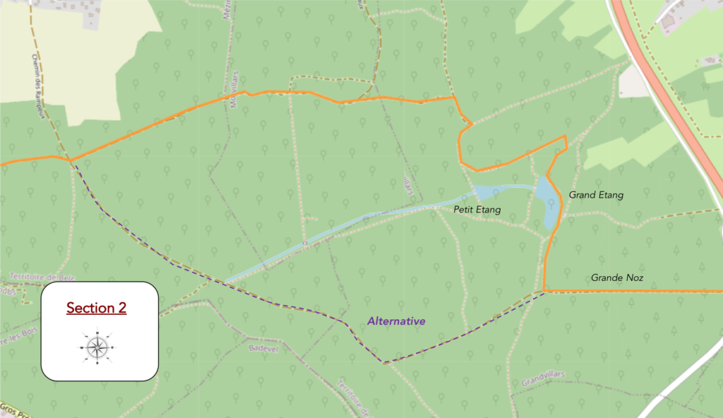 Les hêtres dominent toujours, droits et nombreux, mais par endroits, les épicéas percent timidement à travers les futaies, comme s’ils tentaient un retour discret dans ce règne feuillu. Et l’on devine que le chaos forestier commence à céder un peu de terrain à l’ordre. Les chemins s’organisent, se dessinent mieux. La forêt devient moins inquiétante. On va finir par en sortir, c’est certain. Cette forêt, parfois si labyrinthique, si étouffante pour le pauvre pèlerin qui craint à tout instant de se perdre, semble enfin vouloir l’épargner. Peu après, vous rejoindrez le point d’arrivée de l’alternative mentionnée plus tôt. Les deux chemins, séparés depuis longtemps, se rejoignent ici comme deux lignes de vie qui, après avoir suivi chacune leur logique, finissent par se croiser. Un instant de réconciliation discrète, presque invisible, si ce n’est pour celui qui sait ce qu’il a évité, ou manqué. Morvillars ? On n’en aura plus entendu parler. Le sentier équestre, avec ses rectangles orange ? Disparus aussi, comme le rectangles verts. Mais les chevaux, eux, trouvent toujours leur chemin, n’est-ce pas ? |