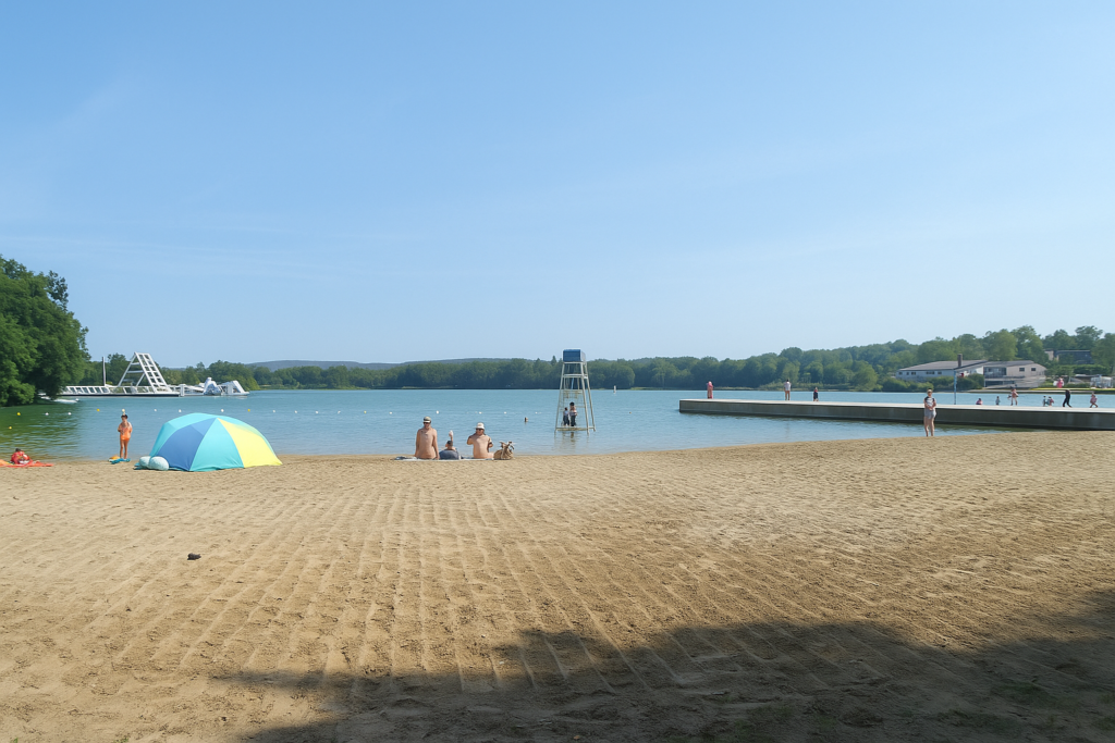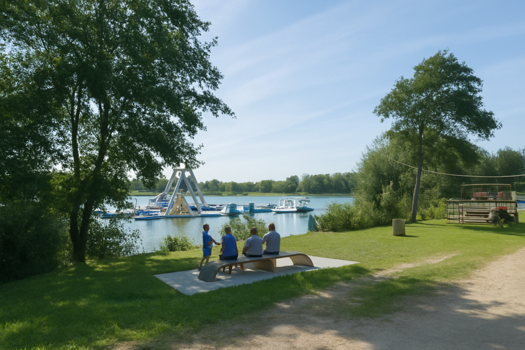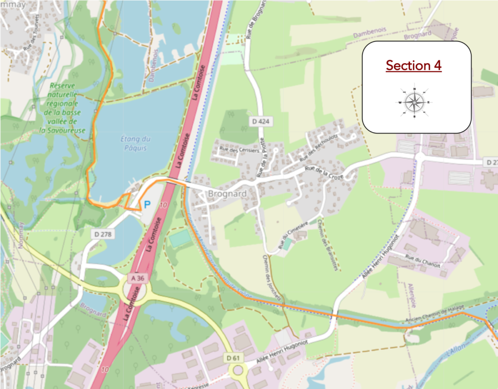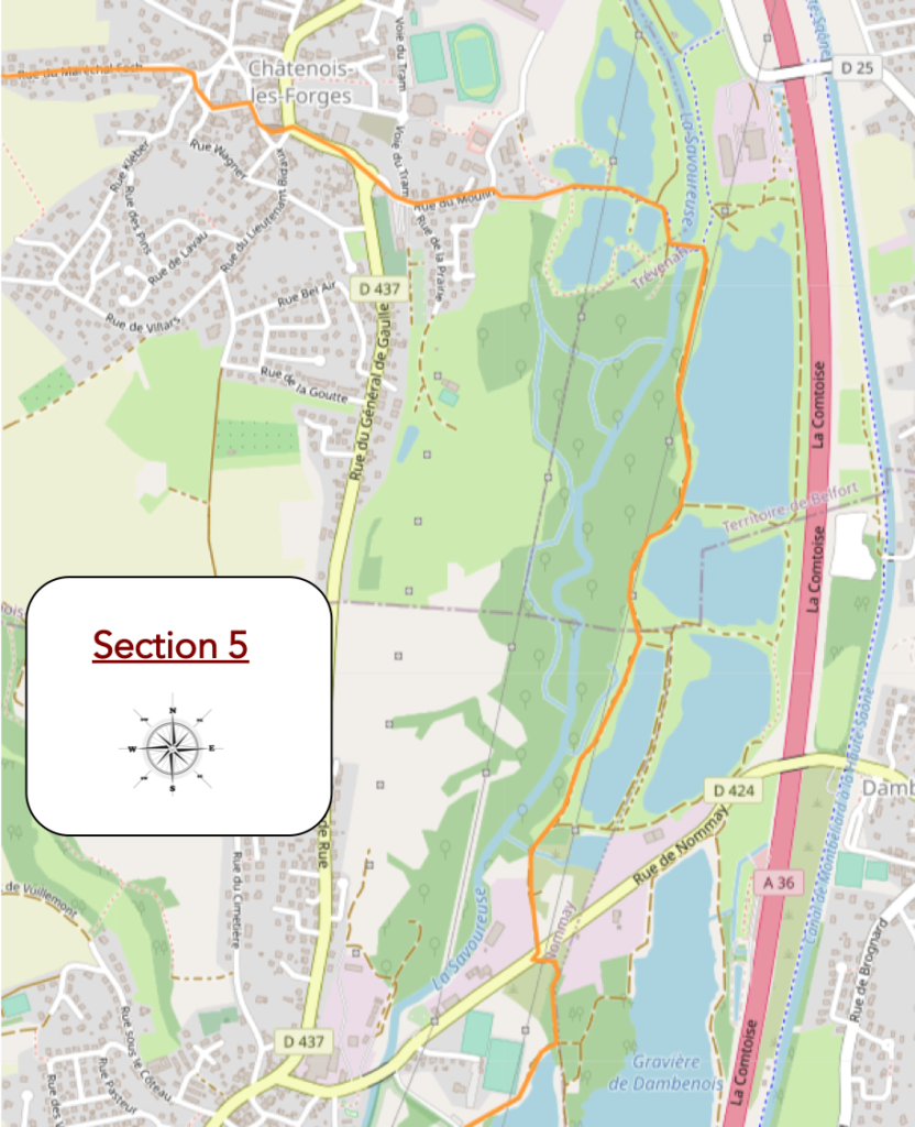 Là, soudainement, tout change à nouveau. Le lieu est aménagé, vivant, presque festif. Un restaurant accueille les affamés. Il y a des toilettes, donc de l’eau, soulagement pour le pèlerin. Le chemin longe, contourne, se faufile. Ici, la base nautique est un royaume pour les familles : plage, paddle, aires de jeux. Entre les étangs et les sentiers, serpente la Savoureuse, rivière discrète, parfois solitaire, parfois dissoute dans les étangs. |