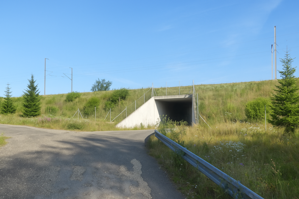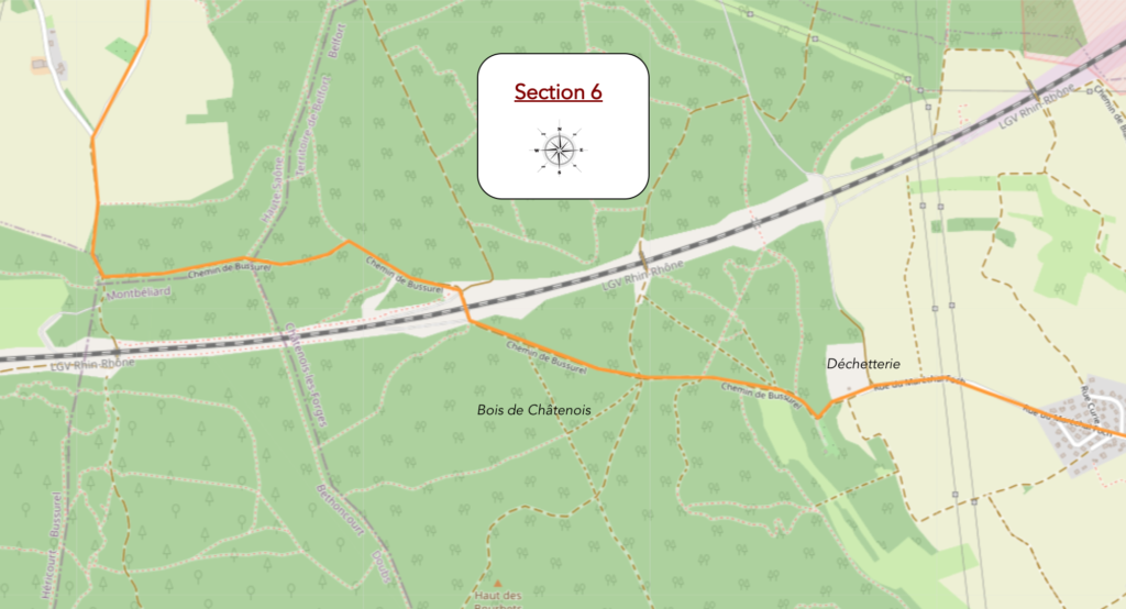 Après une très longue distance, le chemin se dirige vers la la ligne du TGV Rhin-Rhône. |