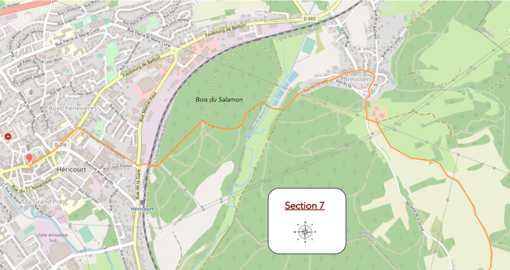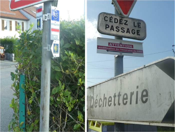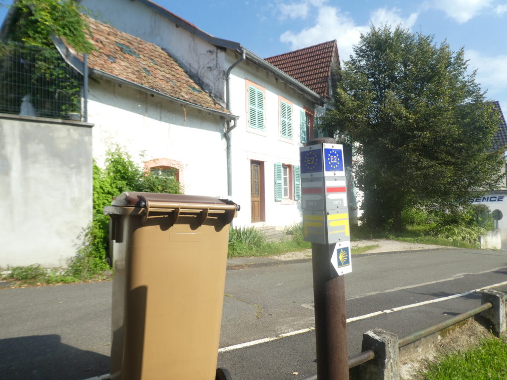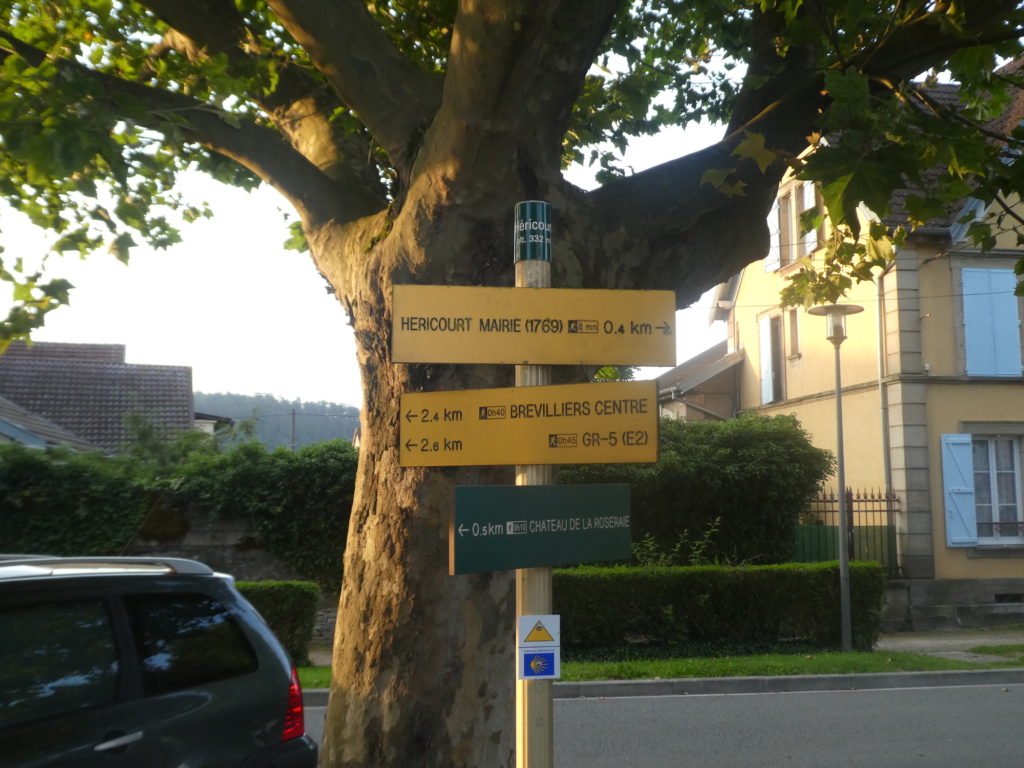 Ceux qui connaissent le Chemin de Compostelle préfèrent suivre le GR5, généralement bien balisé. Ici pourtant, c’est une erreur. Pourquoi ? Parce que le GR5 évite Héricourt, et pour y arriver ensuite, c’est un vrai parcours du combattant. Il vaut mieux tout de même trouver un endroit pour passer la nuit. Héricourt est le bon choix. Le bon choix, ici, est celui indiqué par un triangle jaune, qui traverse Brevilliers par la Rue de l’École. C’est le bon chemin, bien noté dans le petit guide des Amis de Compostelle.