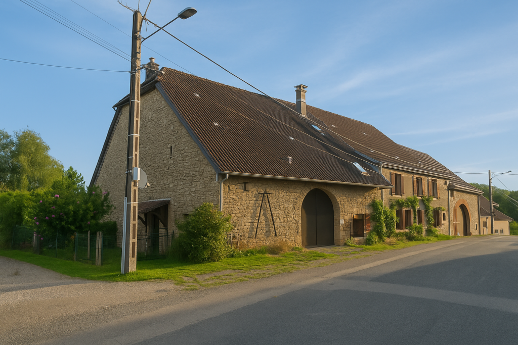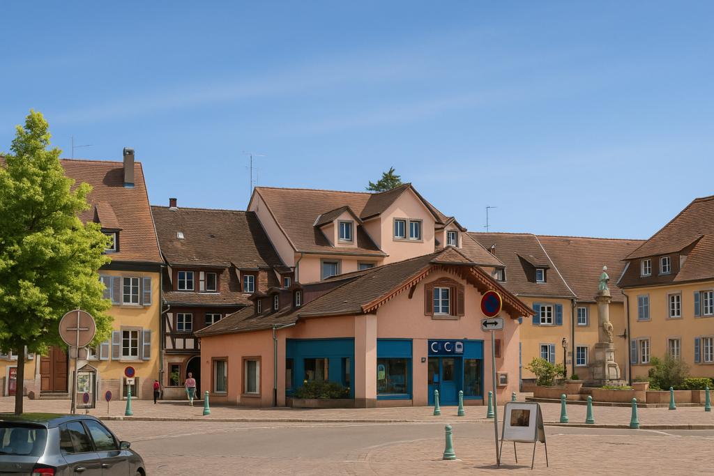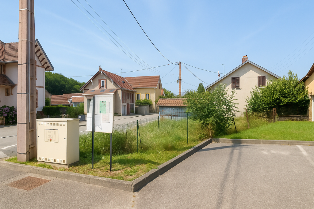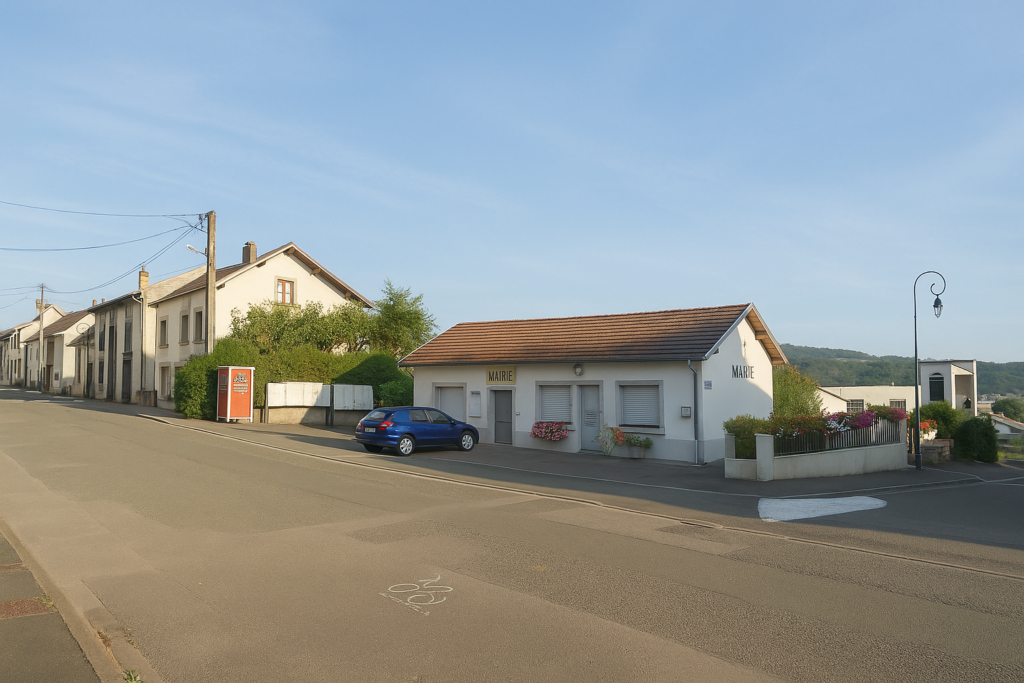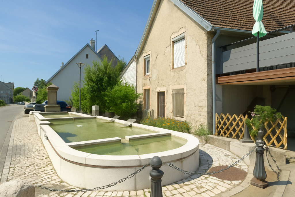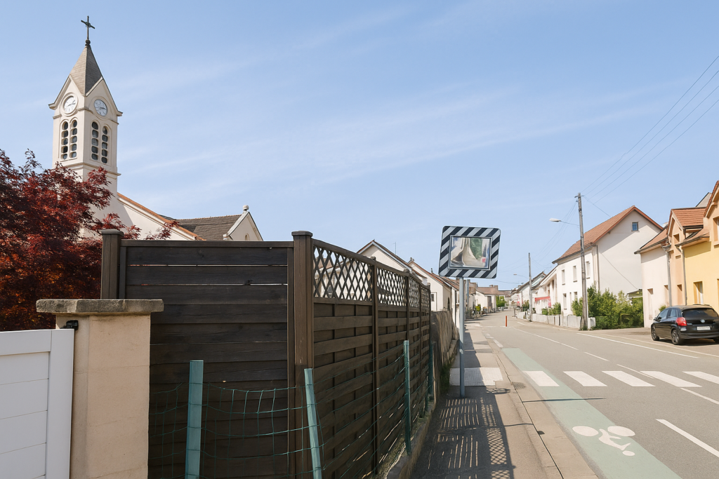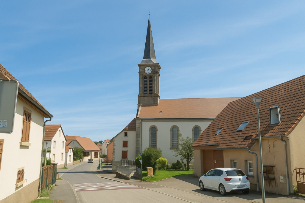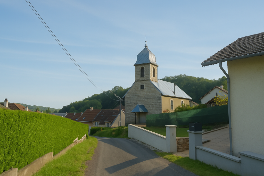 Une ruelle très pentue vous mène au cœur du village. Vous passez devant le temple, simple et moderne, comme souvent en terre protestante. Cette zone, autour d’Héricourt, est marquée par la tradition réformée. |