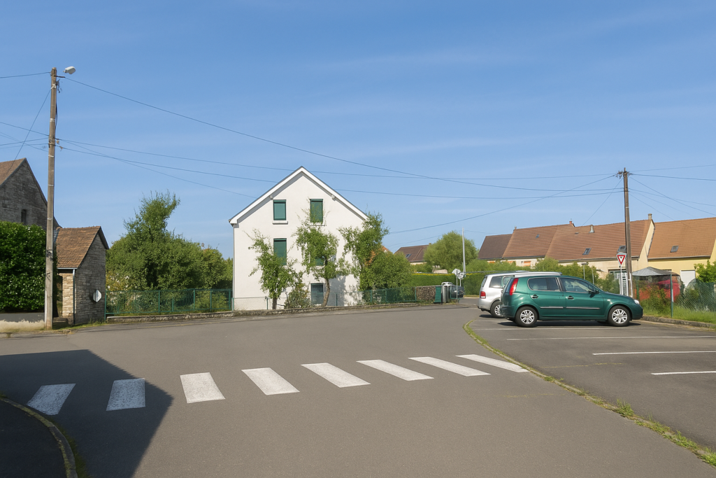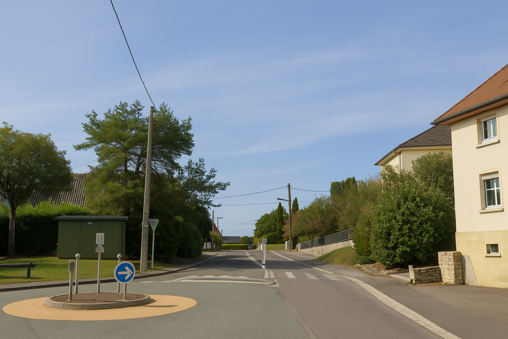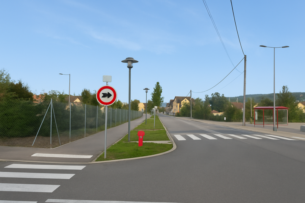 Le parcours traverse alors un carrefour en périphérie du centre du bourg. |