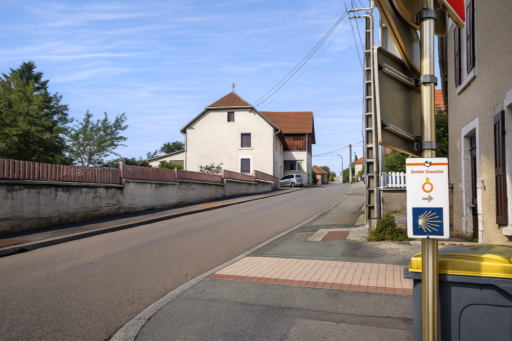 Il existe, quelque part sur Internet, un petit ouvrage sans prétention : Le Chemin de Saint-Jacques de Compostelle – Alsace-Franche-Comté-Bourgogne. Un livre modeste, plus précieux pour ses adresses de gîtes que pour l’indication des chemins. Car les parcours qu’il suggère sont, souvent, de véritables casse-têtes. Cela ne relève pas tant des auteurs eux-mêmes que d’un système local complexe, éclaté. En Alsace comme en Franche-Comté, les balisages prennent des formes diverses : cercles, triangles, losanges, rectangles, et ce, dans un joyeux concert de quatre couleurs. Le marcheur, au lieu d’être guidé, devient enquêteur. Où est la voie ? Où est la coquille ? Parfois absente, parfois cachée. Et pour corser le tout, surgissent les GR, ces grands itinéraires nationaux qui croisent votre route sans vous prévenir. Le GR5, en l’occurrence, que l’on croisera aujourd’hui. Mais qu’on se rassure : il sera discret, presque courtois. À peine une ombre portée sur votre parcours. Vous verrez, en nous lisant, que cette étape se lit autant qu’elle se vit.