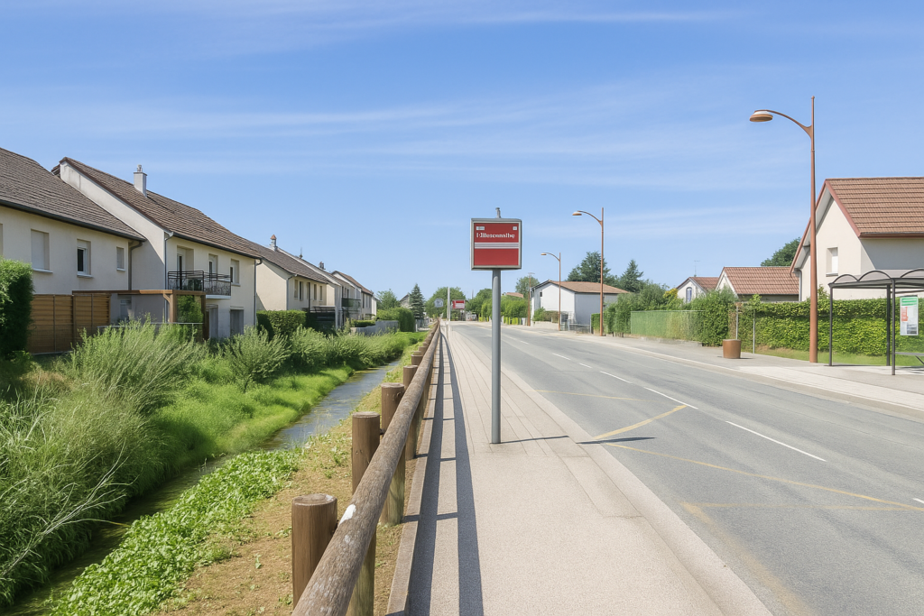 Dès lors, une longue route rectiligne, étroite et sans heurts, se présente. Elle semble s’étirer à l’infini, prenant la direction de Brogard. À 3 km d’ici. |
