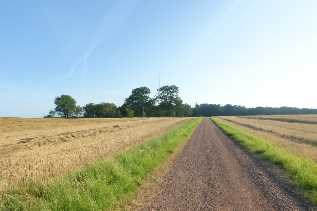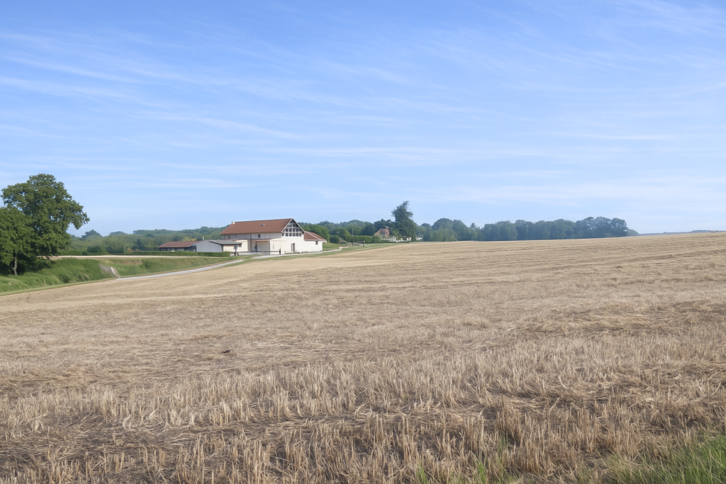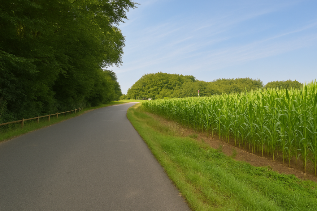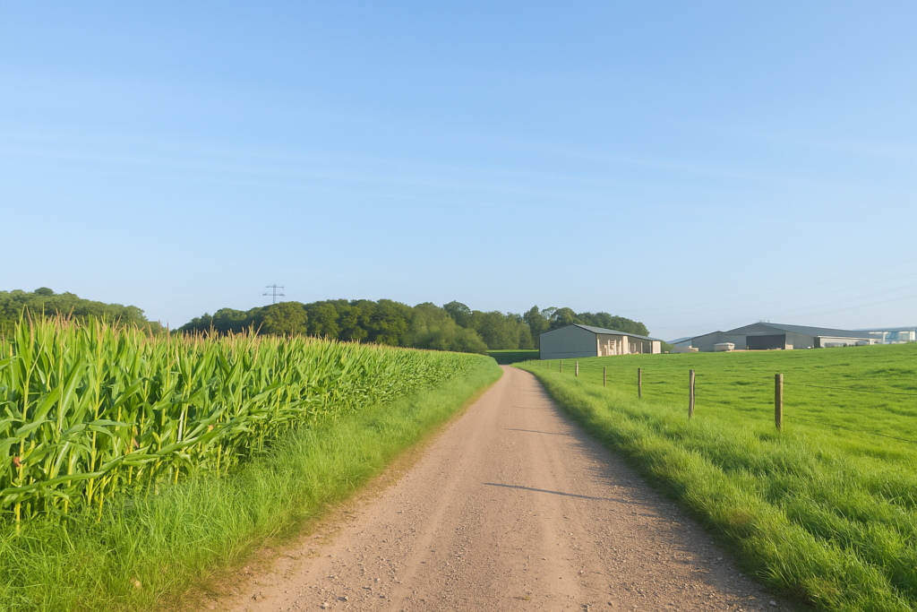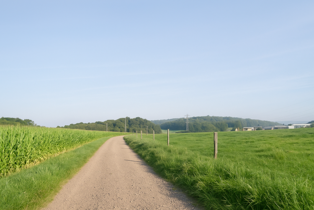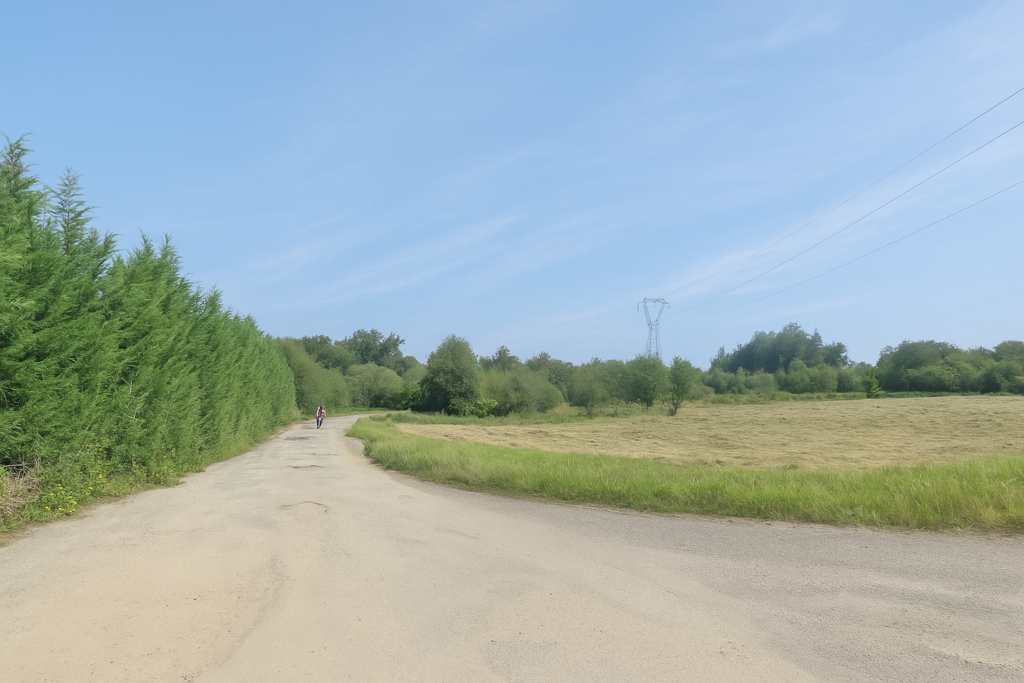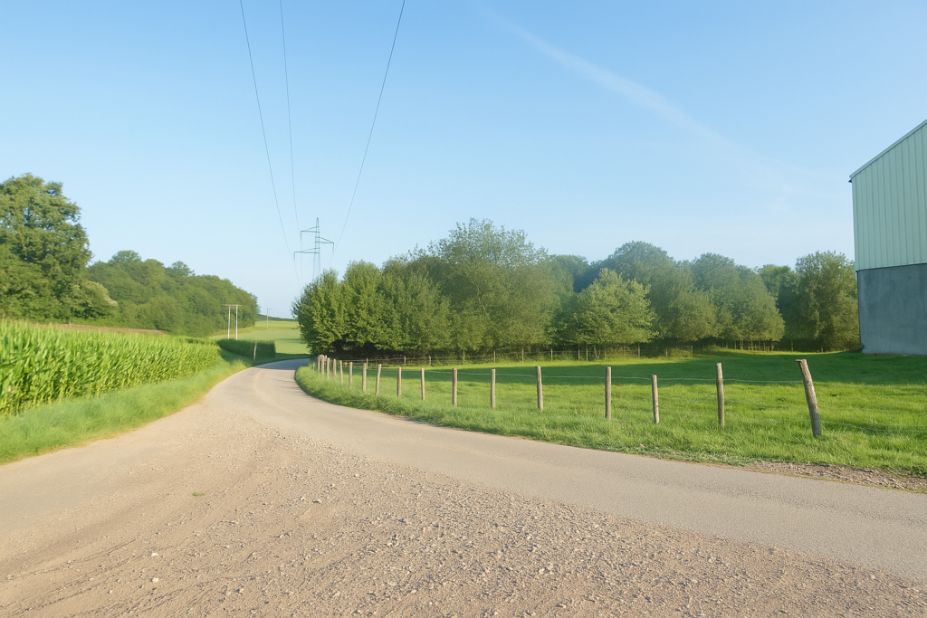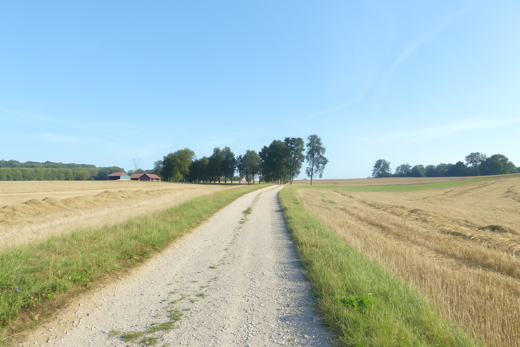 Le chemin longe bientôt une autre grosse exploitation agricole. Ici, les fermes sont vastes, souvent modernes, et témoignent d’une agriculture bien implantée. |