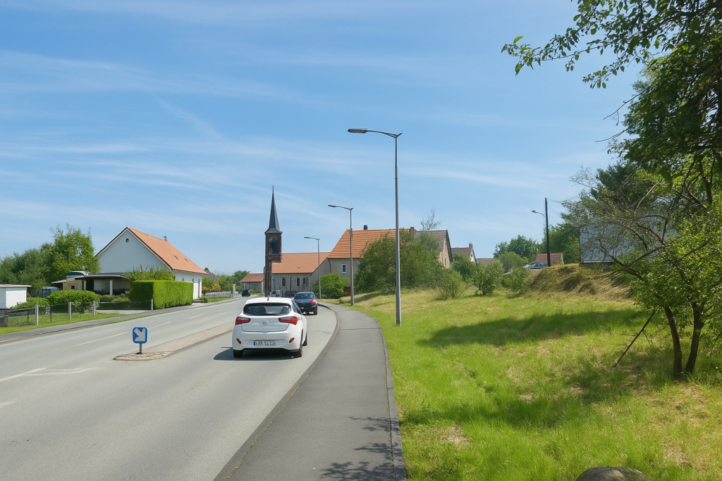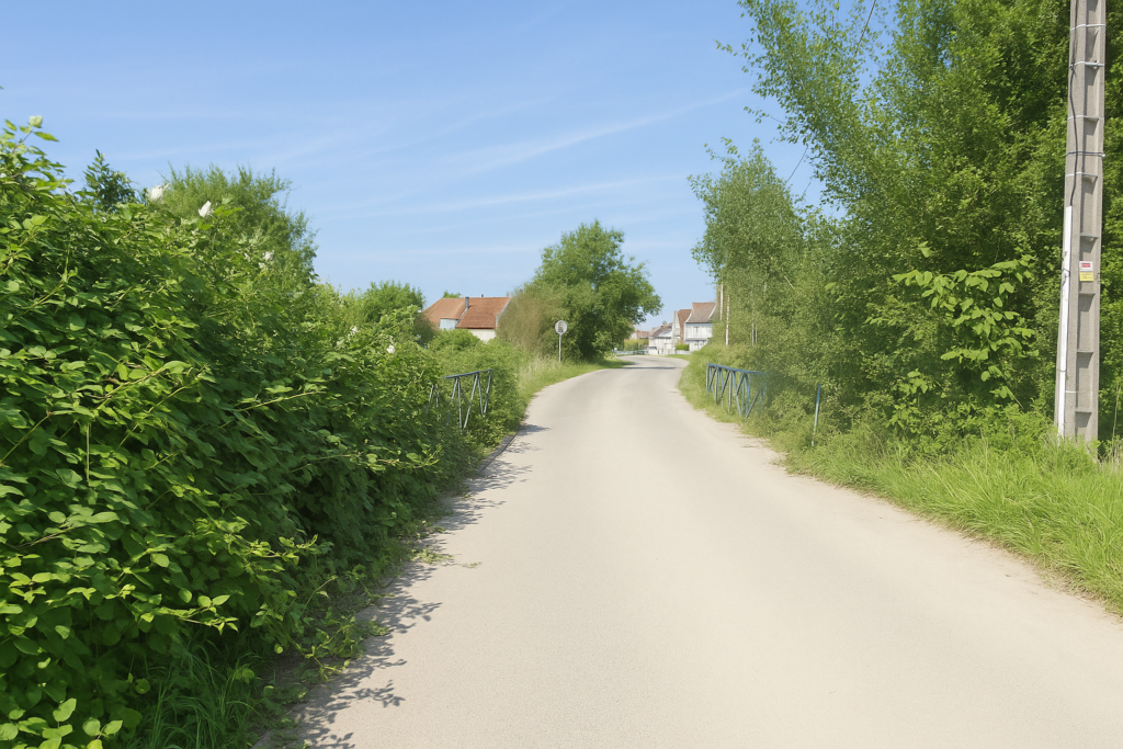 La route traverse le bourg longuement.C’est une ligne droite, presque monotone, et le regard du marcheur y glisse sans s’attarder. Peu de charme ici, mais une continuité, une transition. |