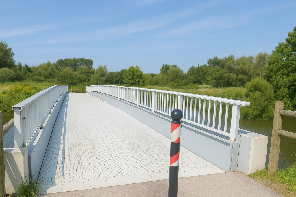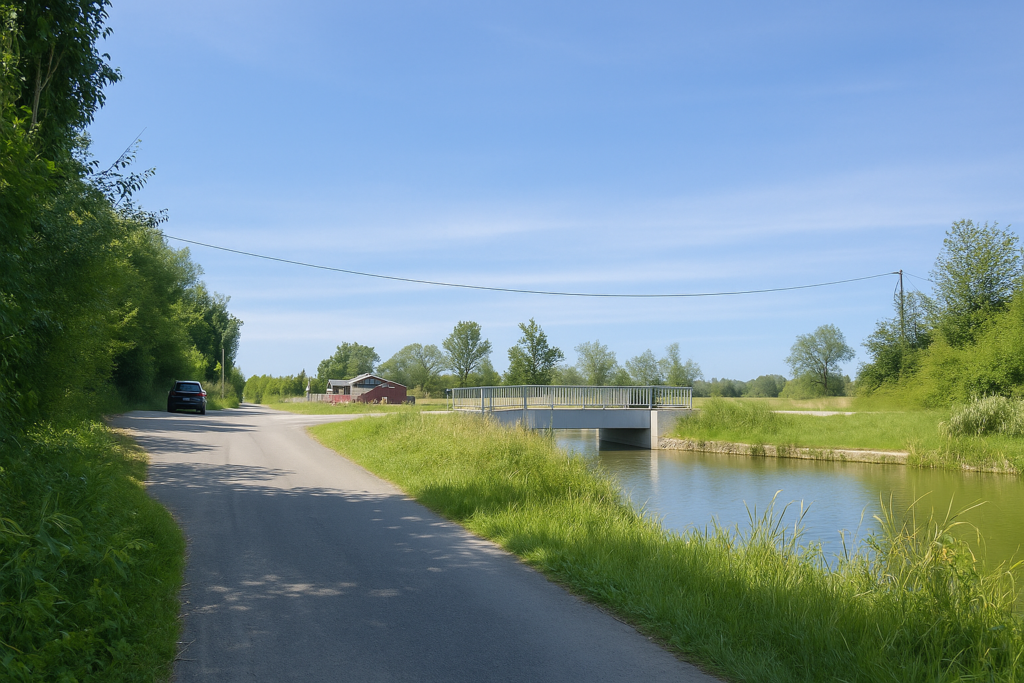 Ici, la route change soudainement de cap. Un angle droit net, sans compromis. Elle file vers un pont-écluse, cette grande mécanique paisible, qui assure la jonction entre les canaux et la rivière Allan. La technique et la nature se rejoignent, ici, dans un équilibre presque poétique. |