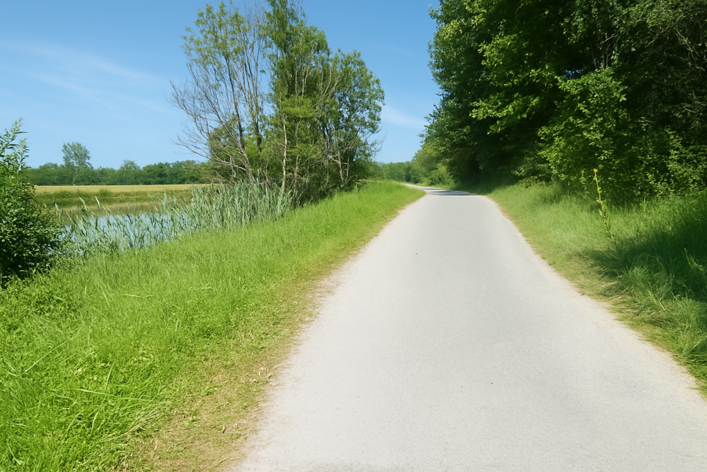 État du parcours : Aujourd’hui, il y a un peu plus de temps passé sur les chemins. Il y a du goudron, mais souvent c’est la piste cyclable et non la route départementale :