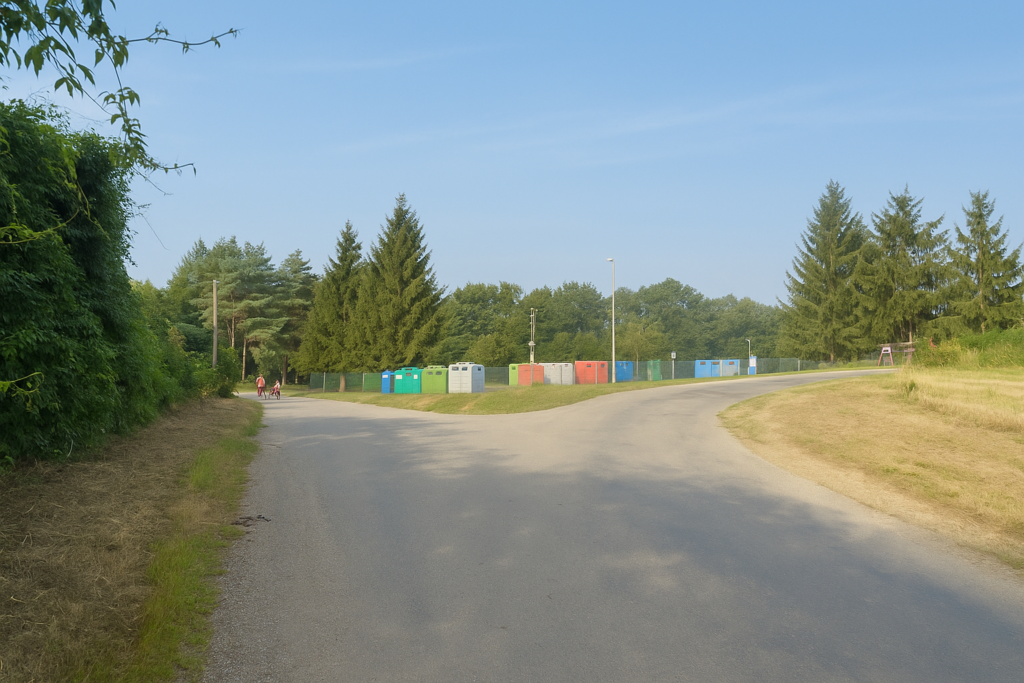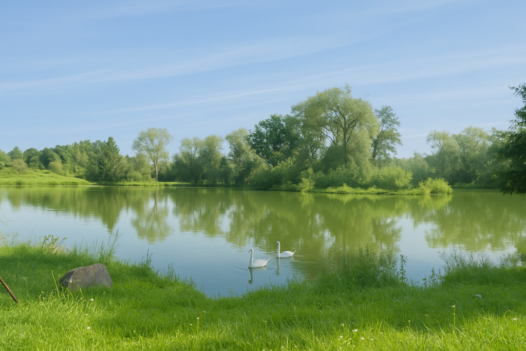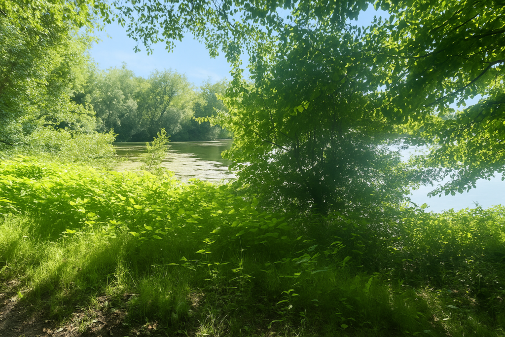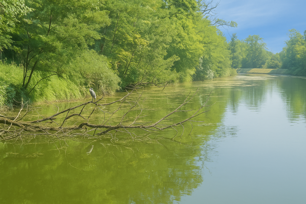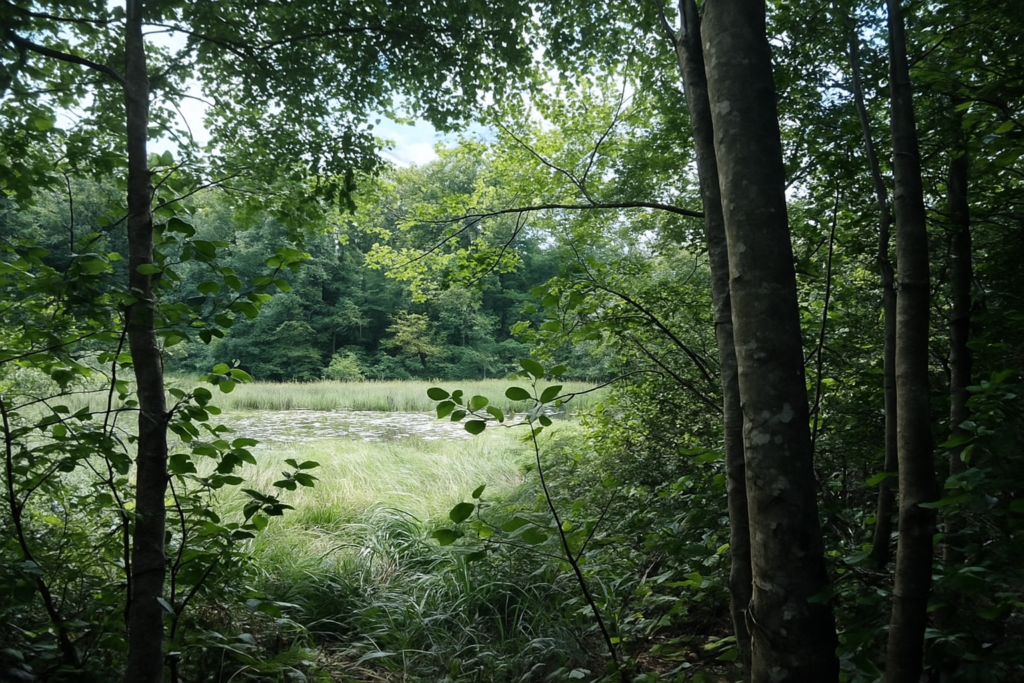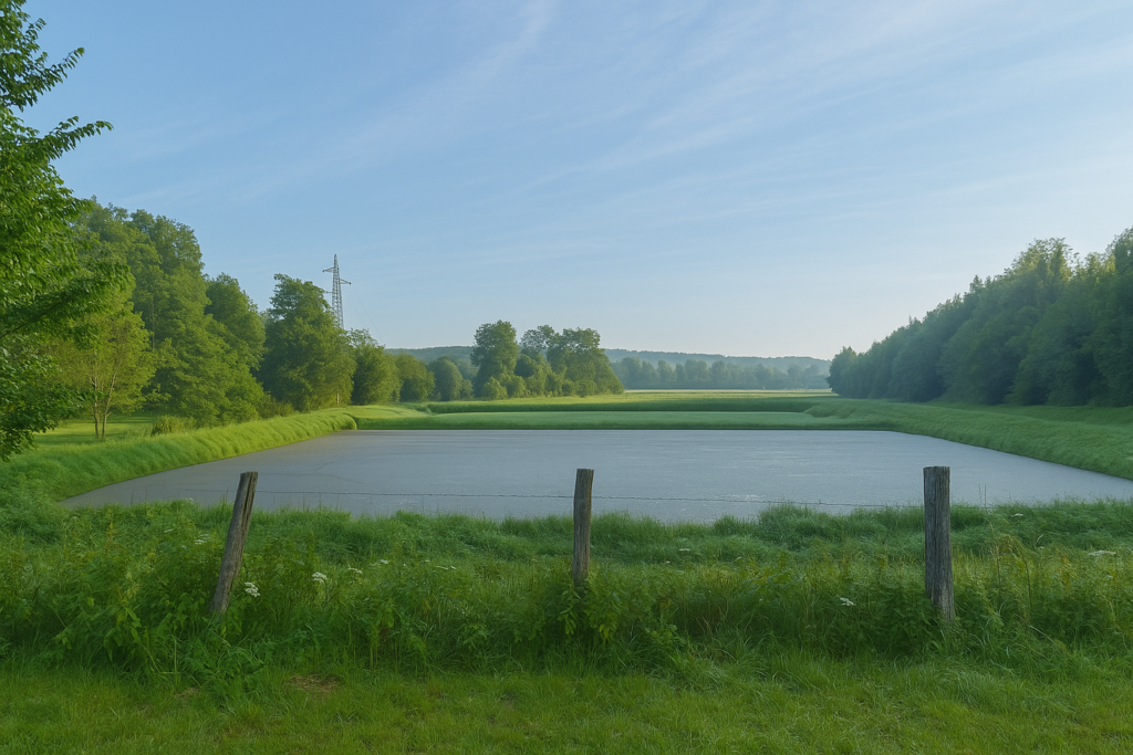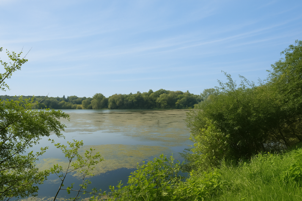 Au fond, surprise : un étang verdâtre occupe le bas-fond, jouxtant une station d’épuration. L’endroit est inattendu, un peu sauvage, un peu technique.