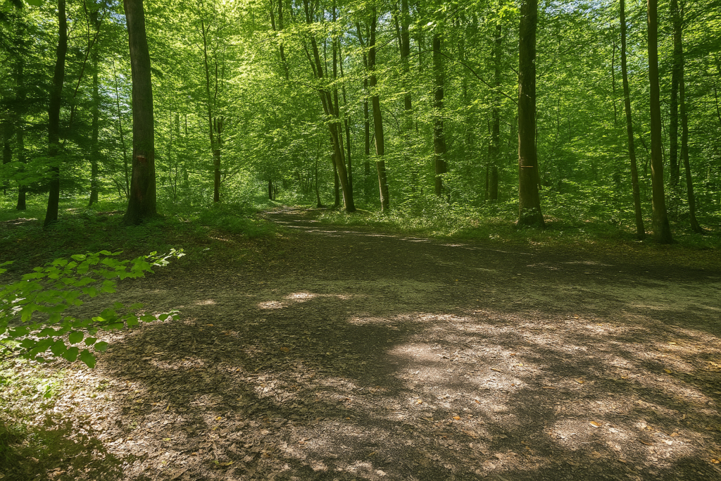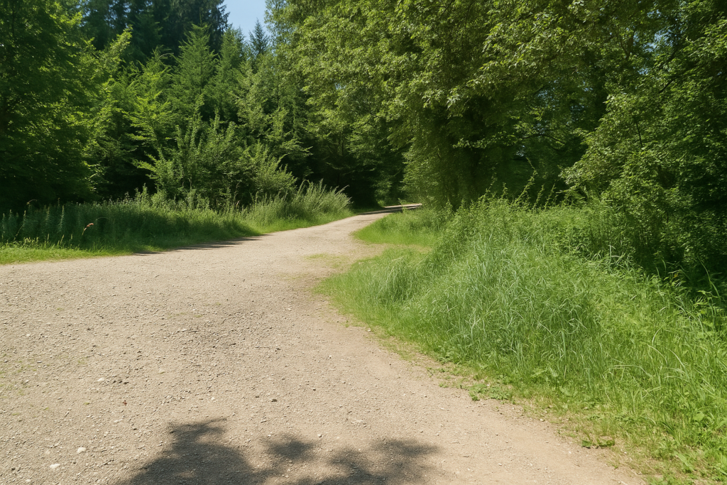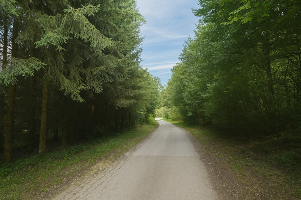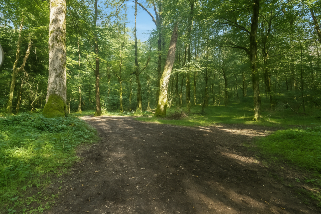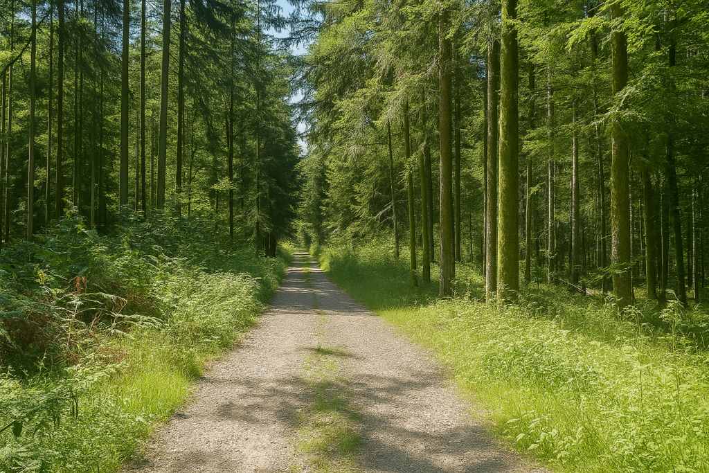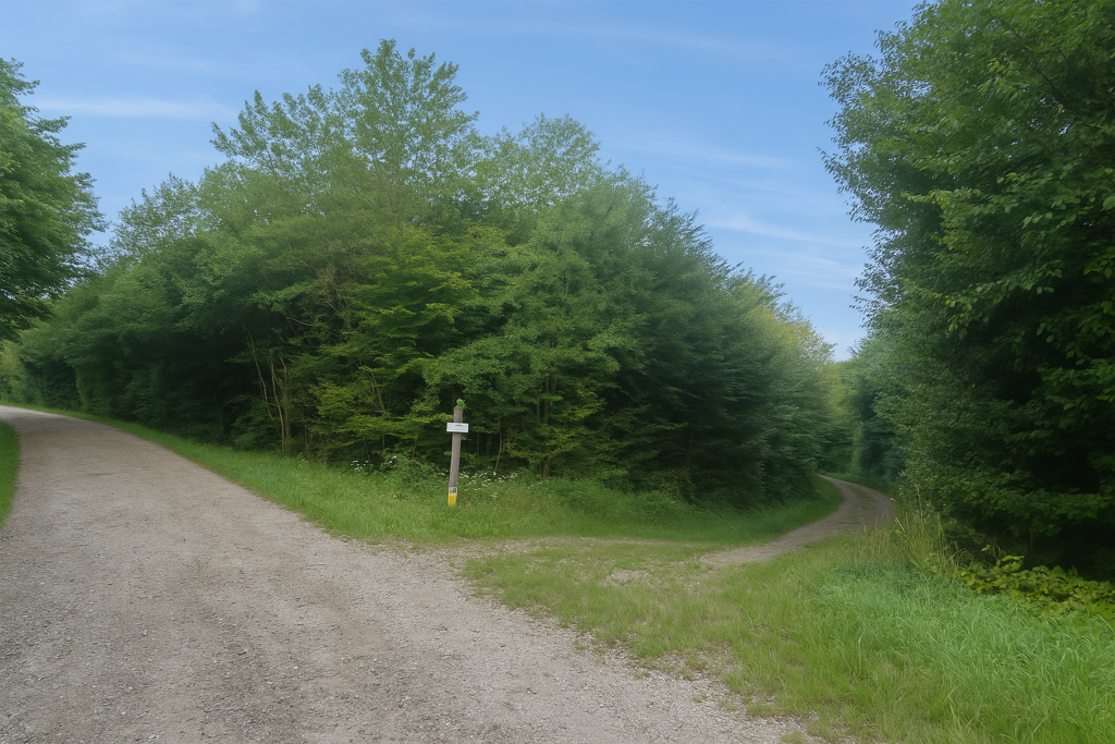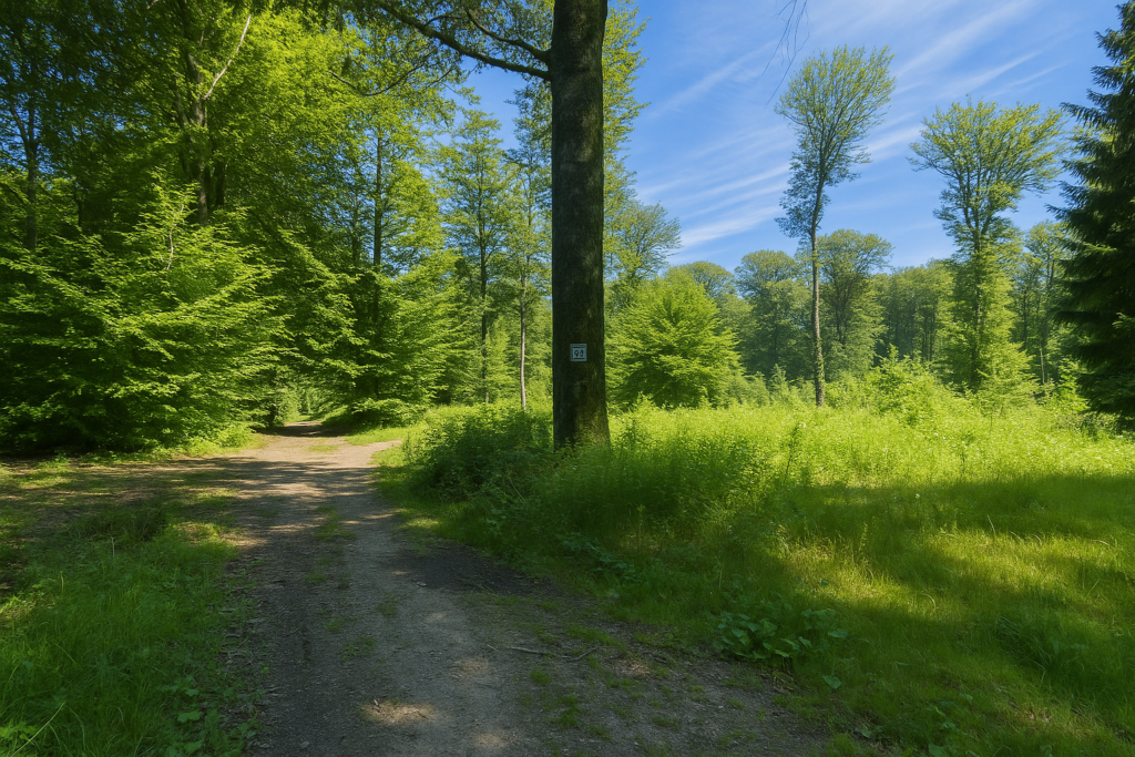 Le tracé est presque rectiligne, filant entre de hauts feuillus et des rangées d’épicéas bien alignés. La promenade devient agréable, régulière, un peu monotone mais paisible, comme une respiration lente au cœur du massif. |