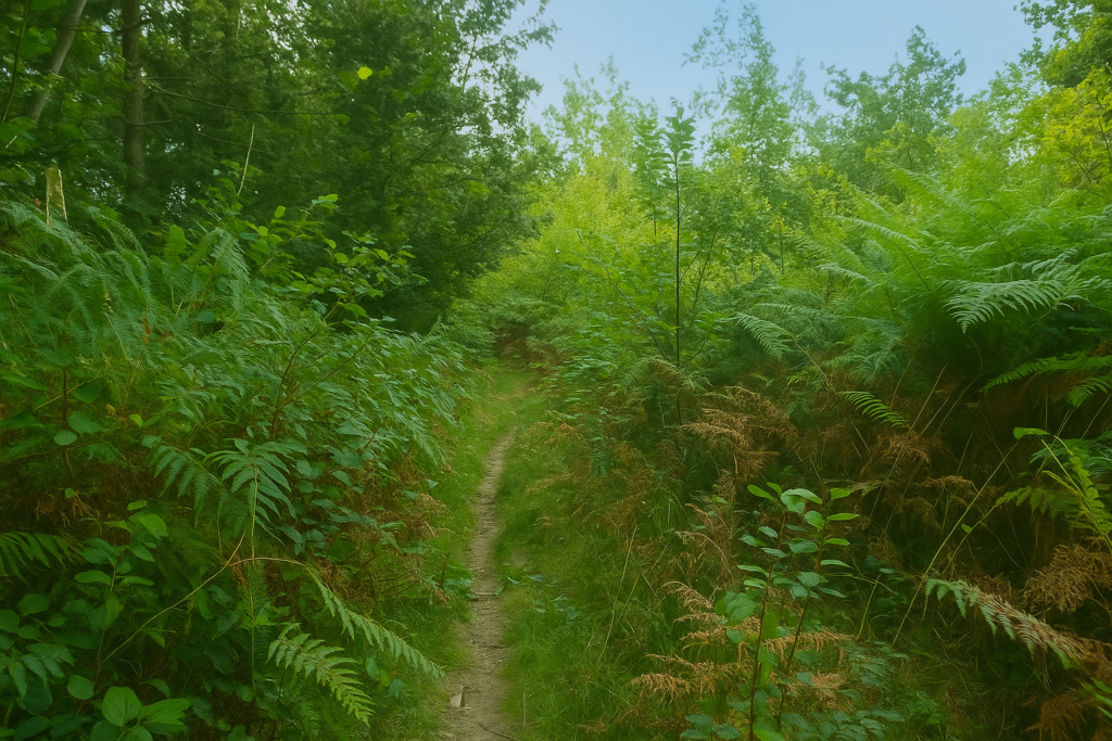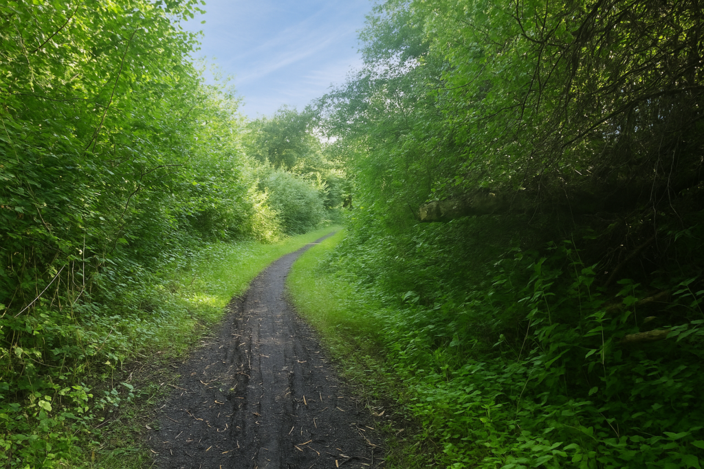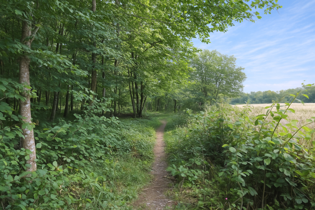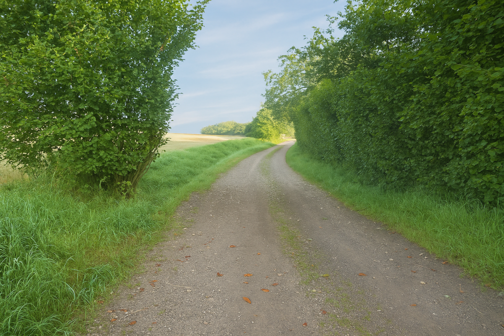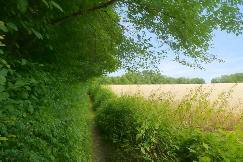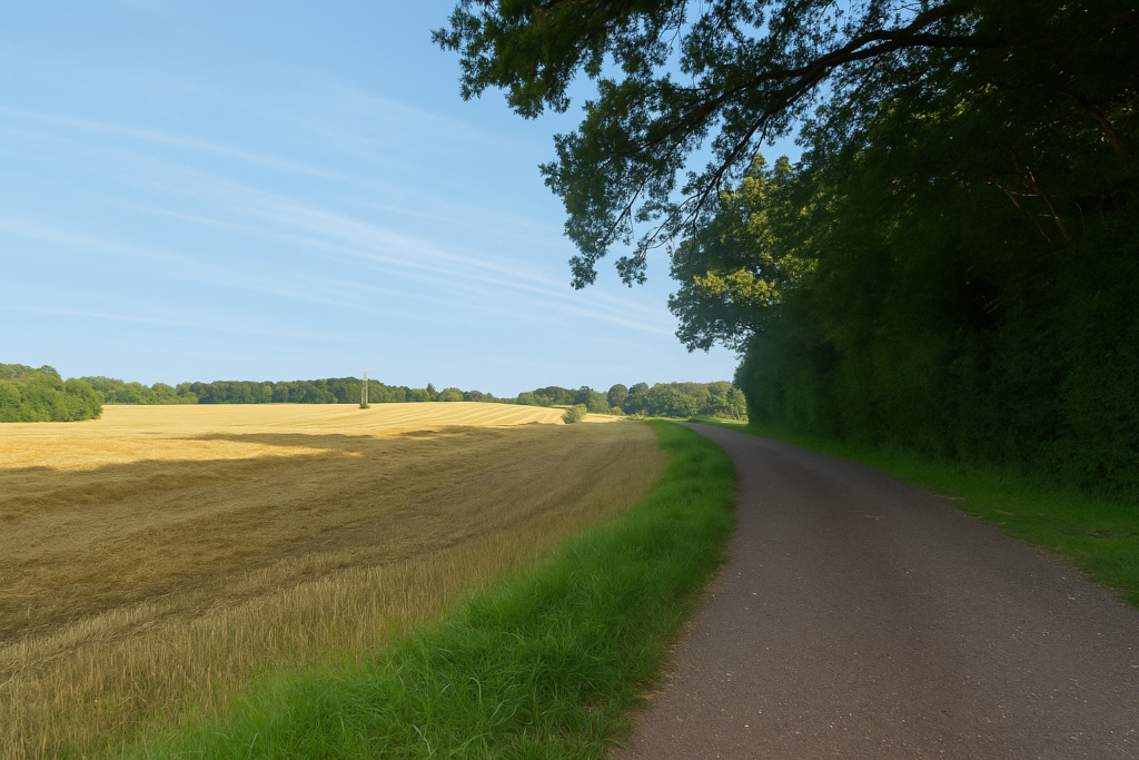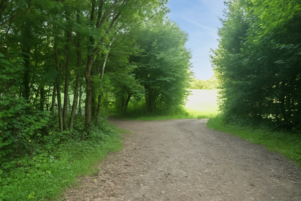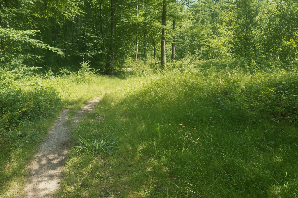 Mais ce tunnel végétal est bref. Peu après, le chemin s’échappe du bois et longe sa lisière, dans une herbe drue et inégale, comme si la forêt, pudique, laissait entrevoir son flanc. Ce passage, mi-clairière, mi-coulisse, accompagne le pas dans une sorte d’entre-deux, un souffle vert au bord de l’ombre. |