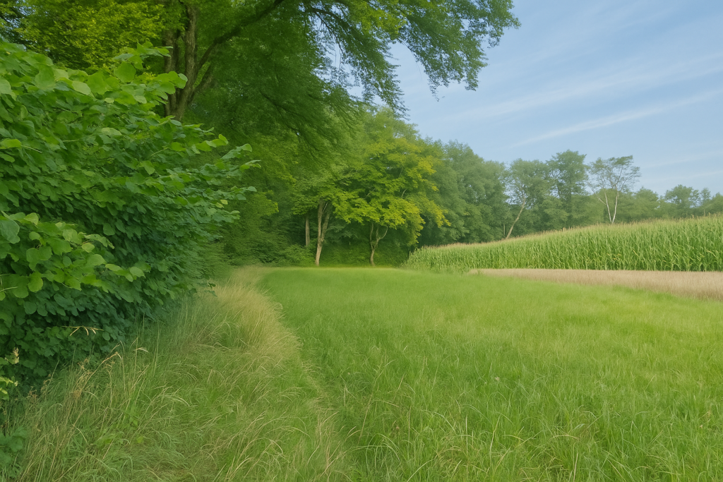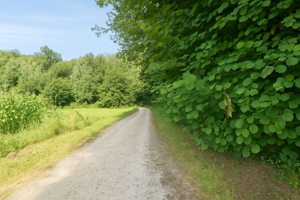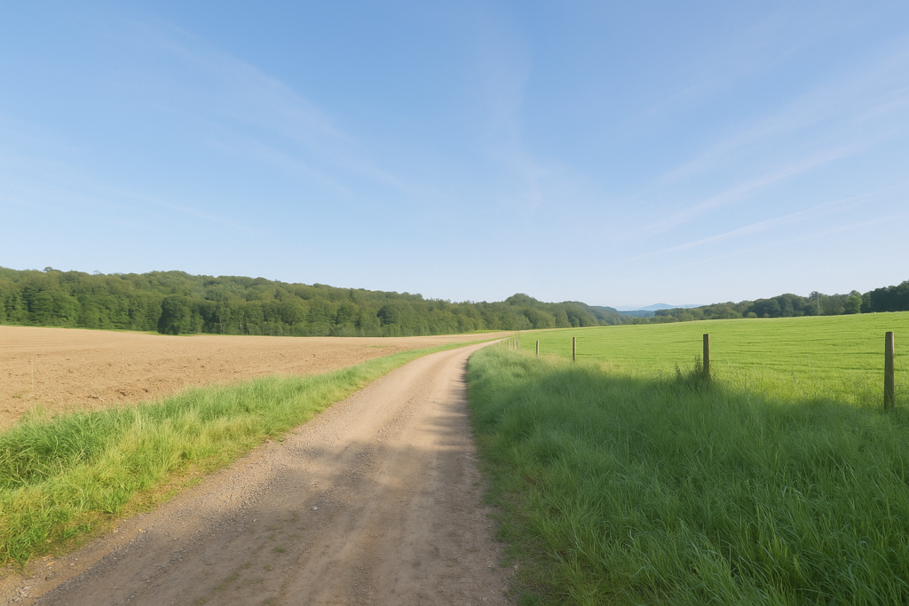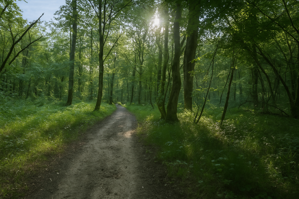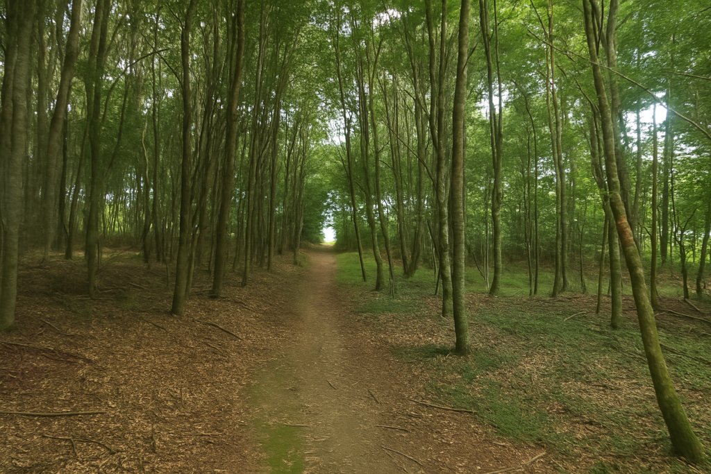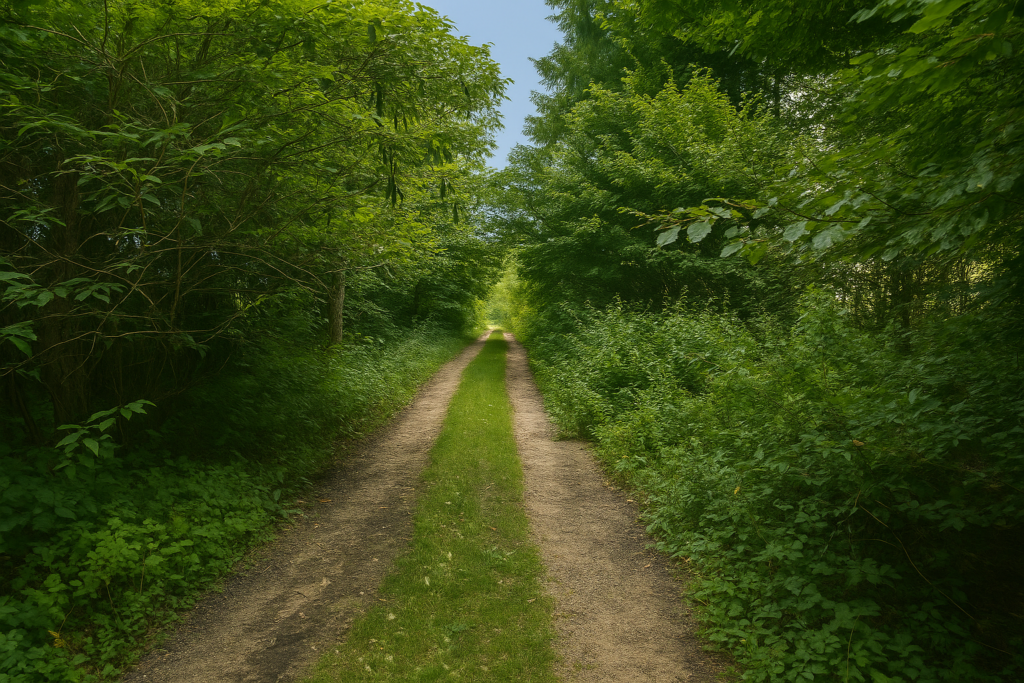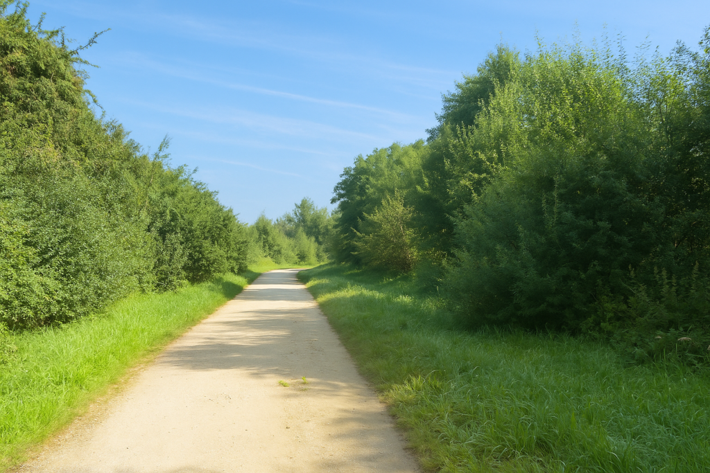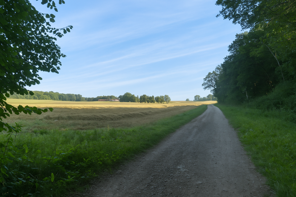 Mais ce tunnel végétal est bref. Peu après, le chemin s’échappe du bois et longe sa lisière, dans une herbe drue et inégale, comme si la forêt, pudique, laissait entrevoir son flanc. Ce passage, mi-clairière, mi-coulisse, accompagne le pas dans une sorte d’entre-deux, un souffle vert au bord de l’ombre. |