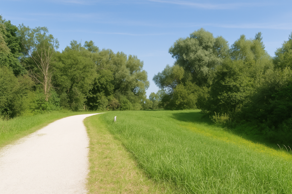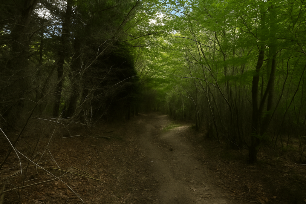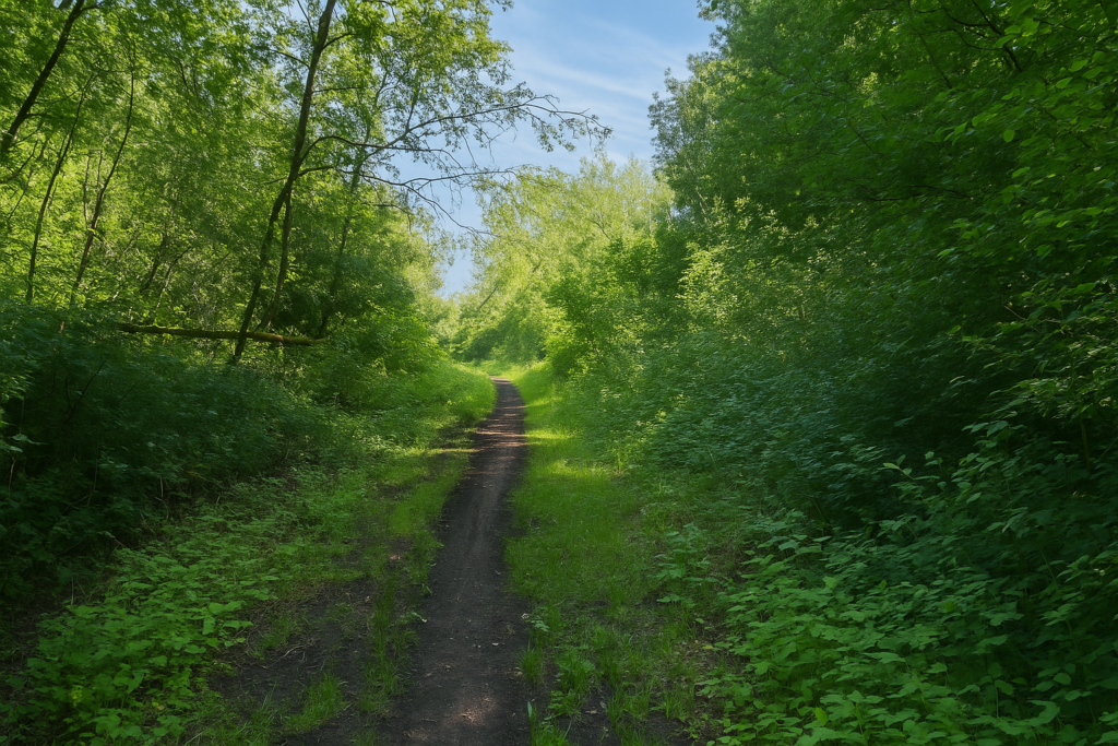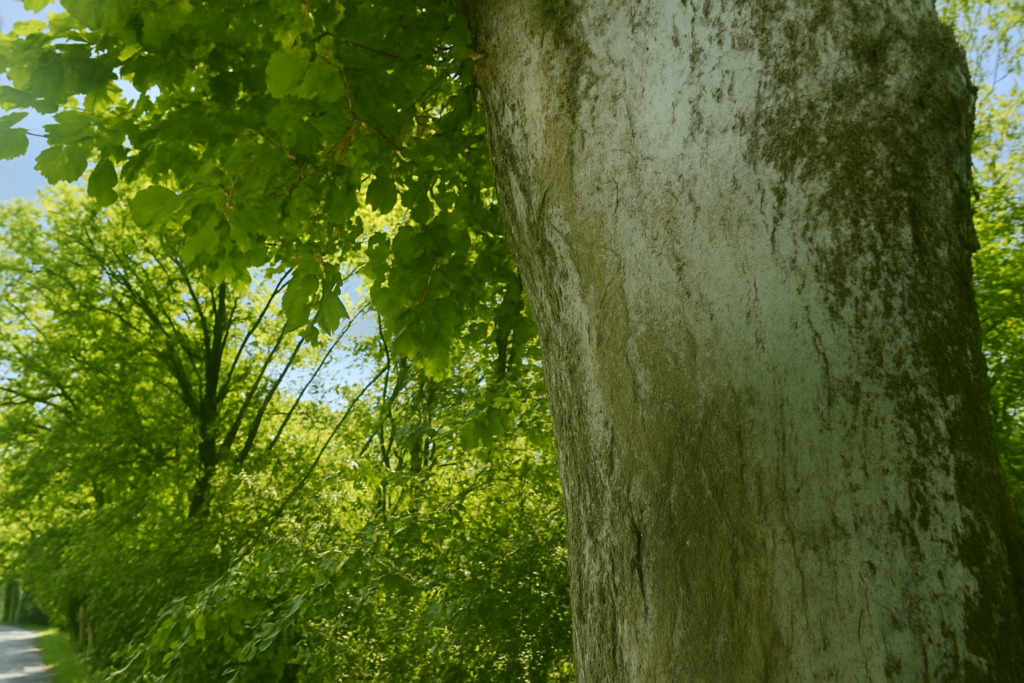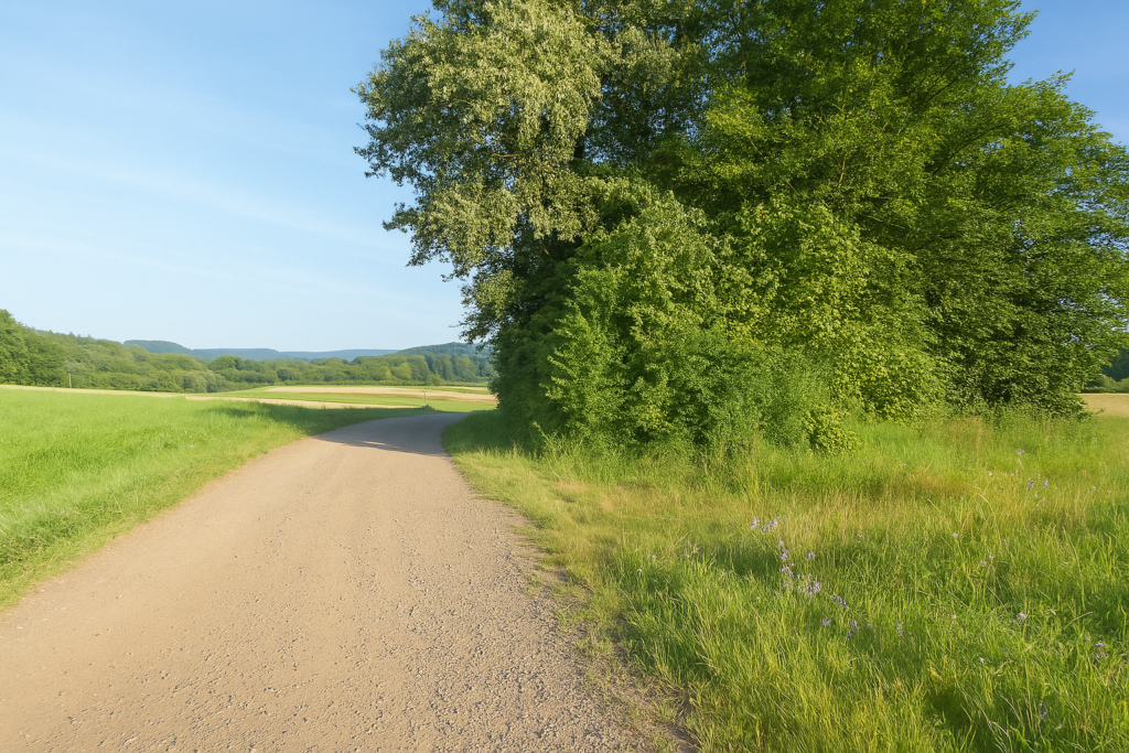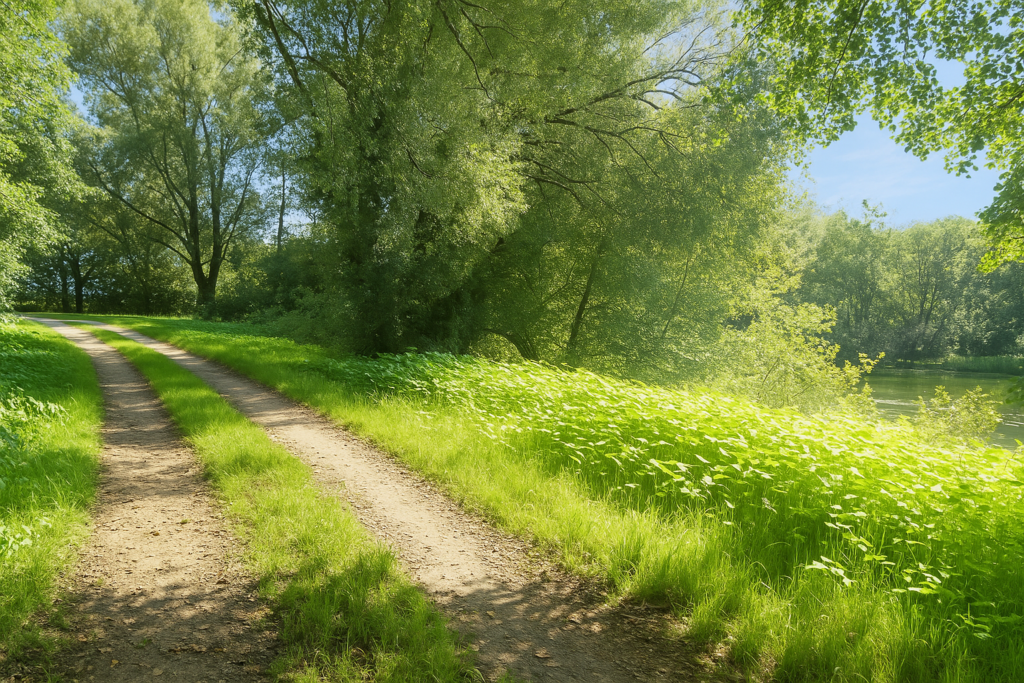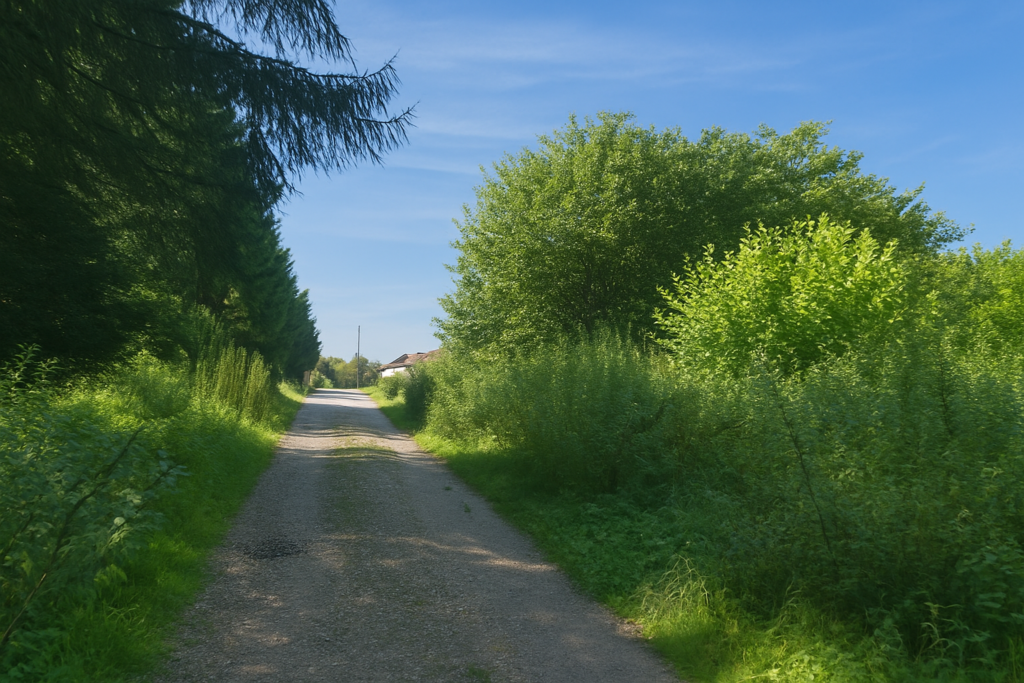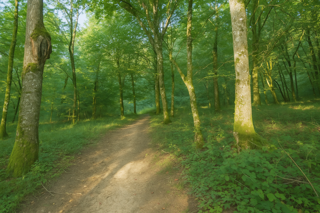 Mais ce tunnel végétal est bref. Peu après, le chemin s’échappe du bois et longe sa lisière, dans une herbe drue et inégale, comme si la forêt, pudique, laissait entrevoir son flanc. Ce passage, mi-clairière, mi-coulisse, accompagne le pas dans une sorte d’entre-deux, un souffle vert au bord de l’ombre. |