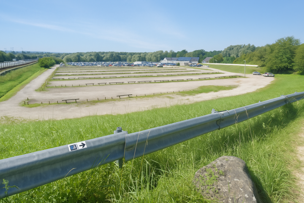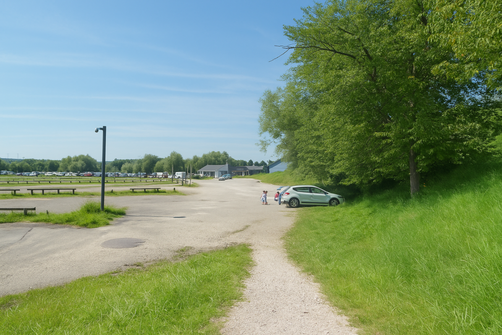 Au bas de la rampe, s’étend un immense parking, prévu pour accueillir des bataillons de touristes, de campeurs, de familles et de plaisanciers. |