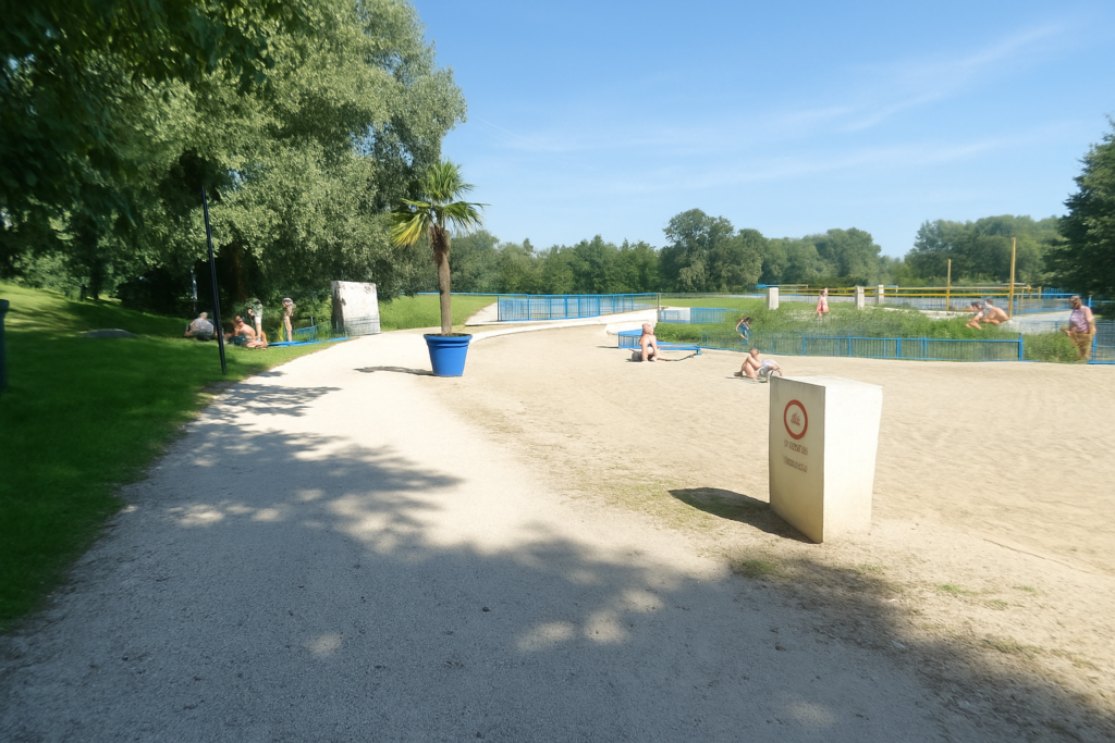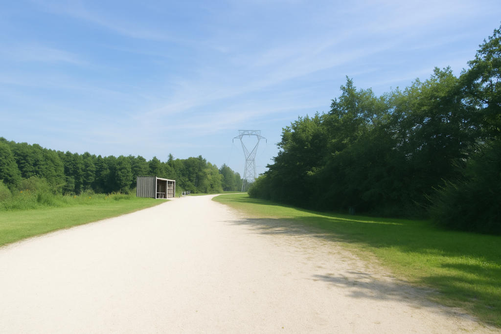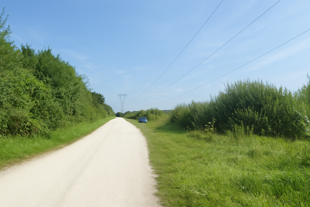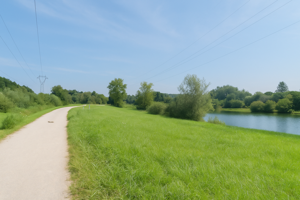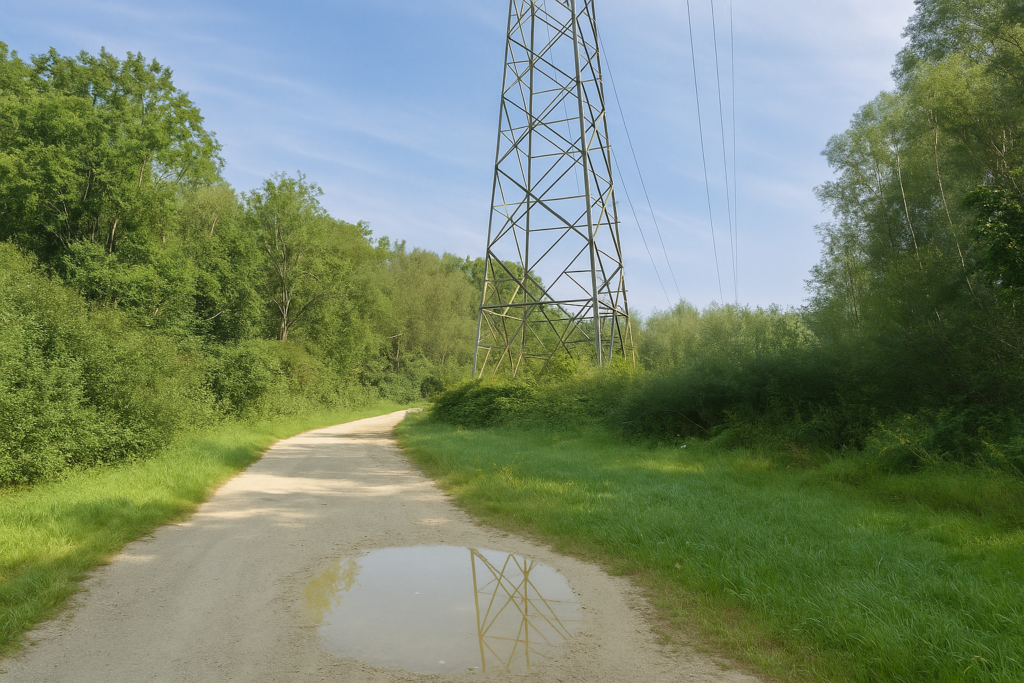 Pour les pêcheurs, c’est un paradis paisible, canne posée, regard figé. Pour les autres, c’est toboggans, rires d’enfants, serviettes colorées et parasols. Mais bientôt, le chemin abandonne ce joyeux tumulte et reprend son rythme, sur une large voie de terre, passant sous les grandes lignes à haute tension. |