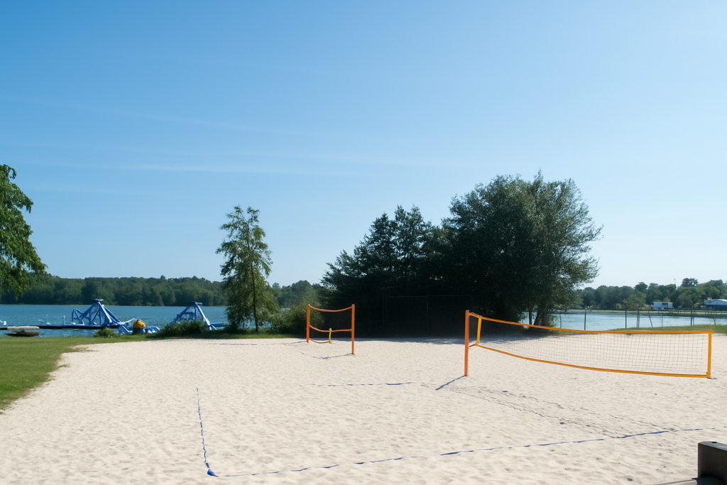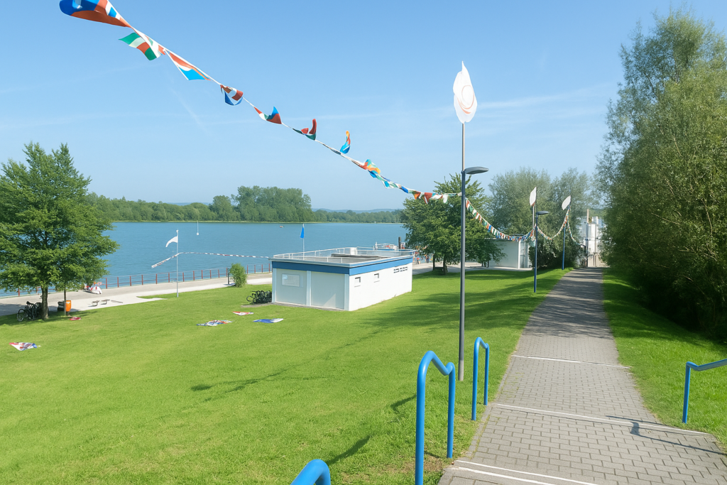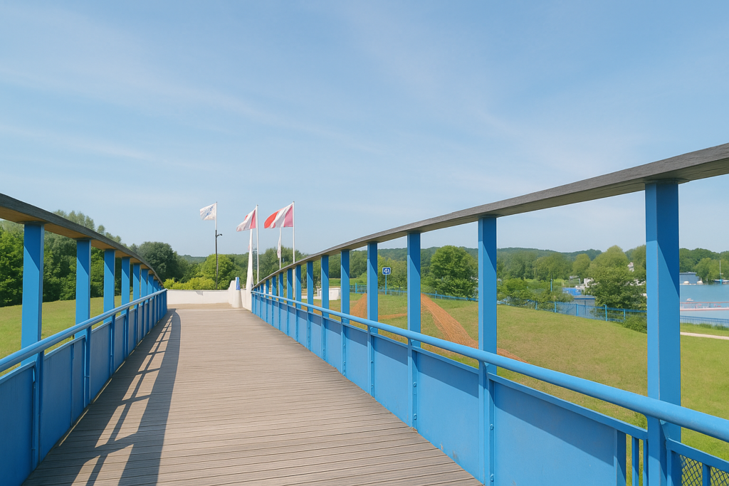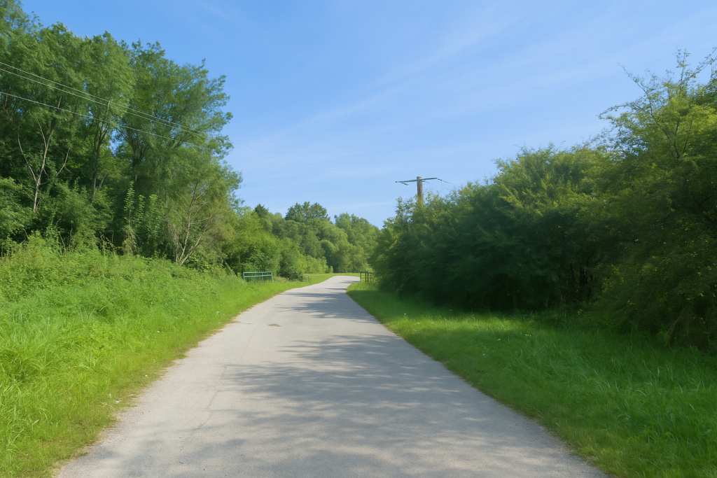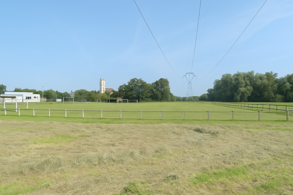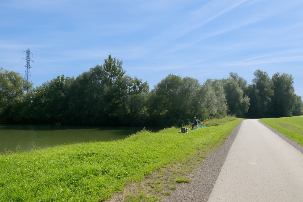 Pour les pêcheurs, c’est un paradis paisible, canne posée, regard figé. Pour les autres, c’est toboggans, rires d’enfants, serviettes colorées et parasols. Mais bientôt, le chemin abandonne ce joyeux tumulte et reprend son rythme, sur une large voie de terre, passant sous les grandes lignes à haute tension. |