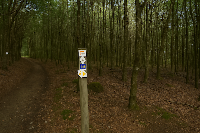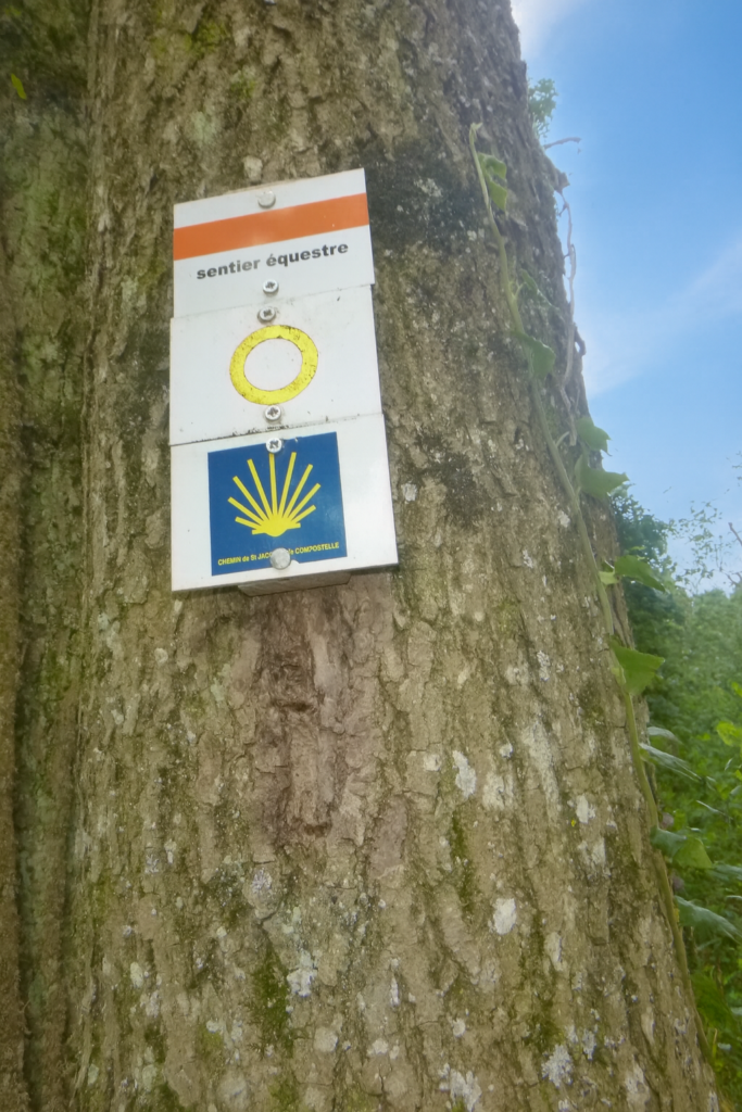 La Rue de la Paix mérite son nom, mais elle se mérite aussi. C’est une rue montante, qui peu à peu quitte l’enceinte urbaine pour se fondre dans la lisière du dehors. Une rue de sortie, de délivrance presque. Pour l’instant, les bifurcations restent rares. Le marcheur débute encore avec assurance. Mais déjà, le balisage spécifique à la région s’impose, avec sa logique propre, parfois déconcertante. Ici, la coquille, votre guide sacré, ne vous montrera jamais le chemin à suivre. Elle est là, discrète, posée sur un arbre ou un muret, et se contente de signifier que vous marchez sur le Chemin de Compostelle. Elle est comme un souffle de mémoire, un simple écho du pèlerinage, mais elle garde le silence sur la direction. C’est là que les doutes commencent, d’autant que l’itinéraire se partage avec deux autres voies. |