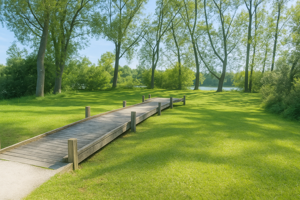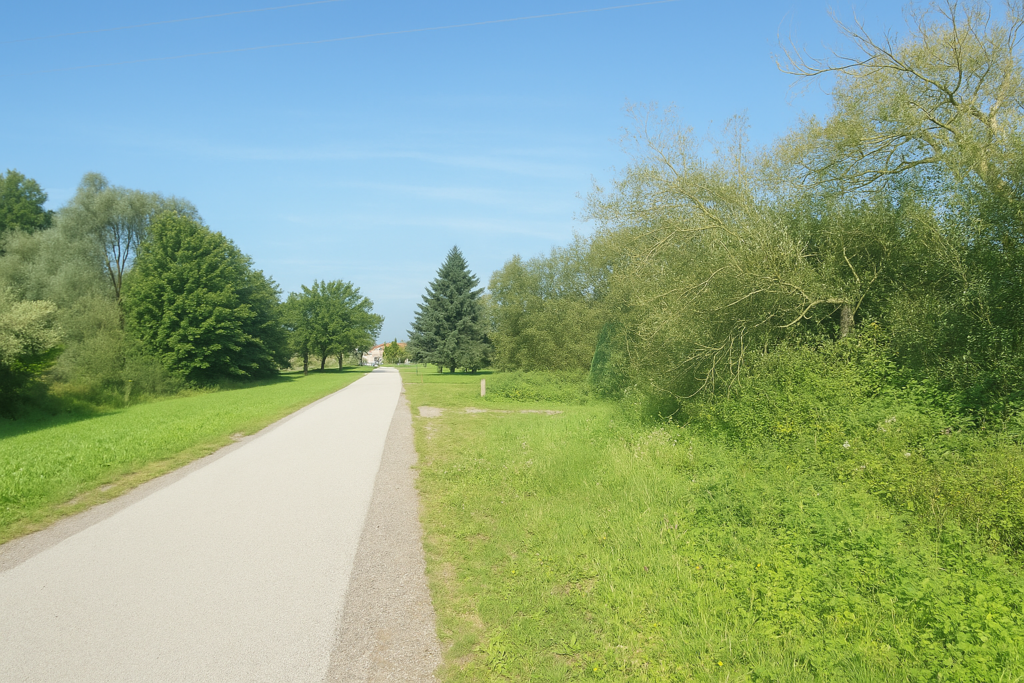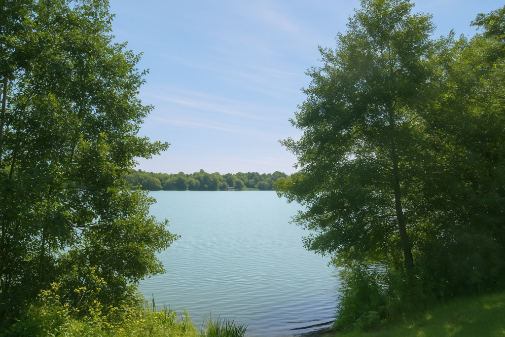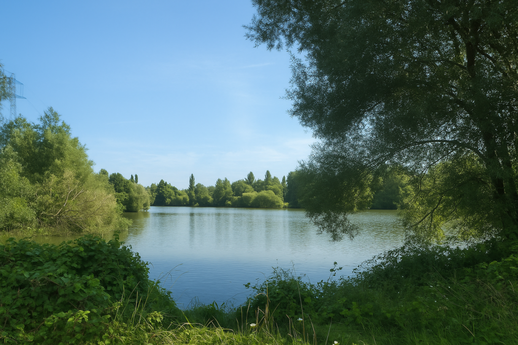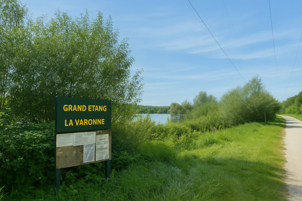 Une petite route contourne les installations, puis revient en douceur près des étangs. À l’entrée d’un nouveau parc, tout s’apaise. Le chemin ici est aussi lisse qu’une voie royale, impeccable. Sur votre gauche, serpente la Savoureuse, discrète et souvent cachée par la végétation. Sur la droite, les grands étangs morcelés de la Varonne s’étendent, vastes et majestueux. |