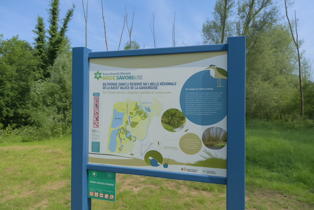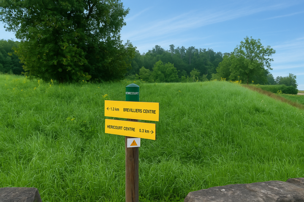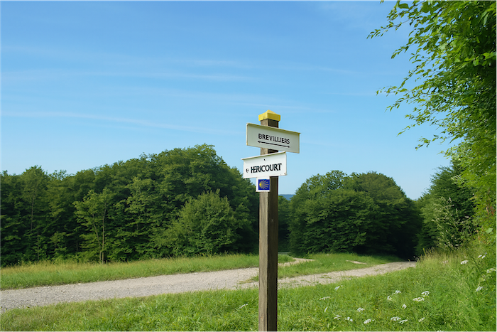 Vous arriverez ensuite à un curieux panneau directionnel, sorte de totem aux couleurs multiples, qui semble presque trop gai pour la solennité des lieux. Brevilliers est annoncé à 45 minutes.