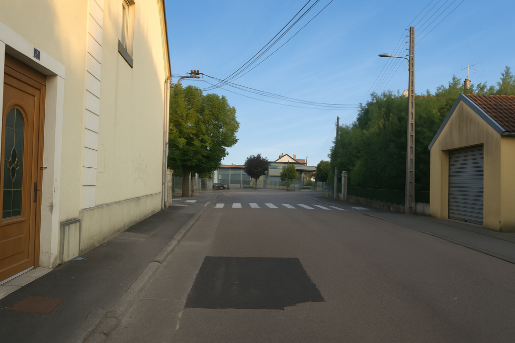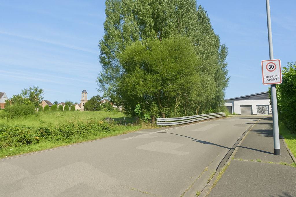 …avant de rejoindre la Rue du Maréchal Foch, longue et droite, qui file en direction de la déchetterie.