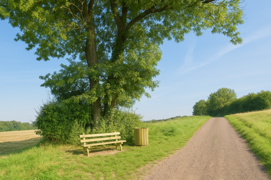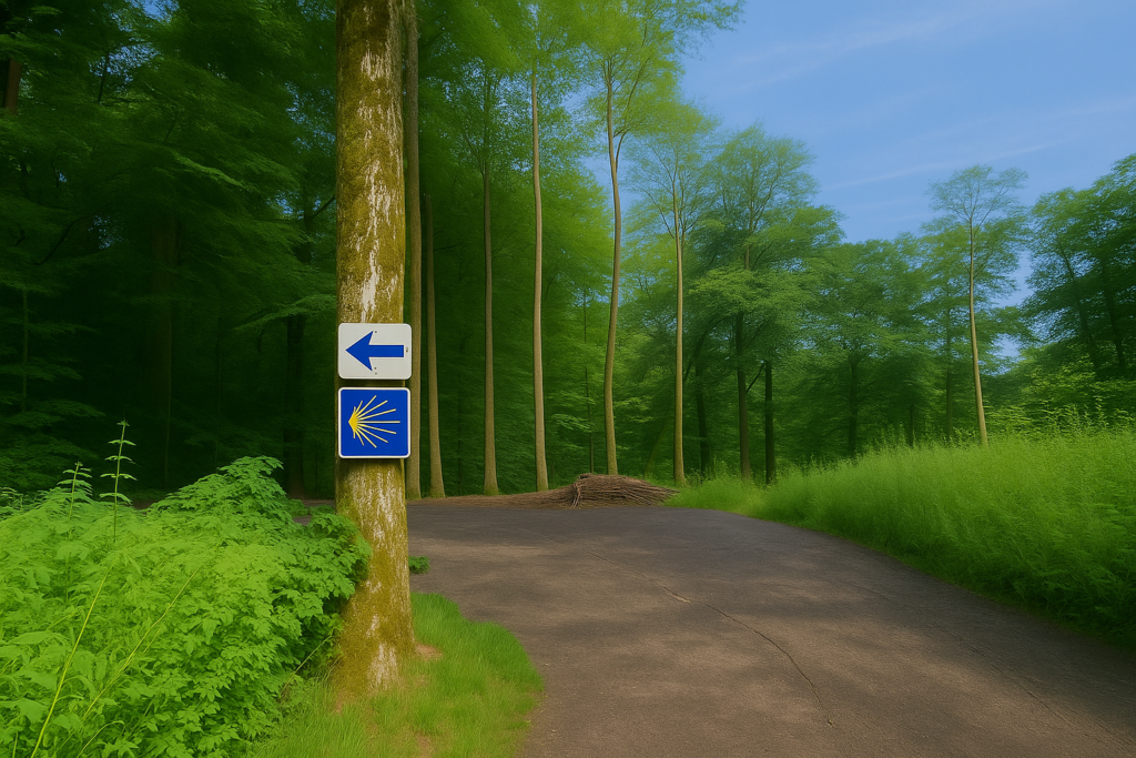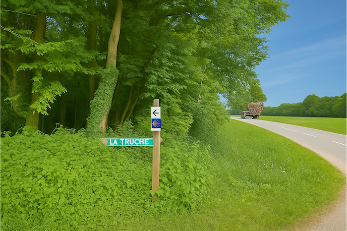 La route emprunte la bien nommée Rue Sous le Bois. Et là, surprise : les coquilles fleurissent à nouveau, multiples, bavardes, presque trop. Ironie du balisage : quand il n’y a plus aucun risque de se perdre, on se retrouve cerné d’indications. Un peu comme ces amis qui vous donnent mille conseils… quand vous n’en avez plus besoin. |