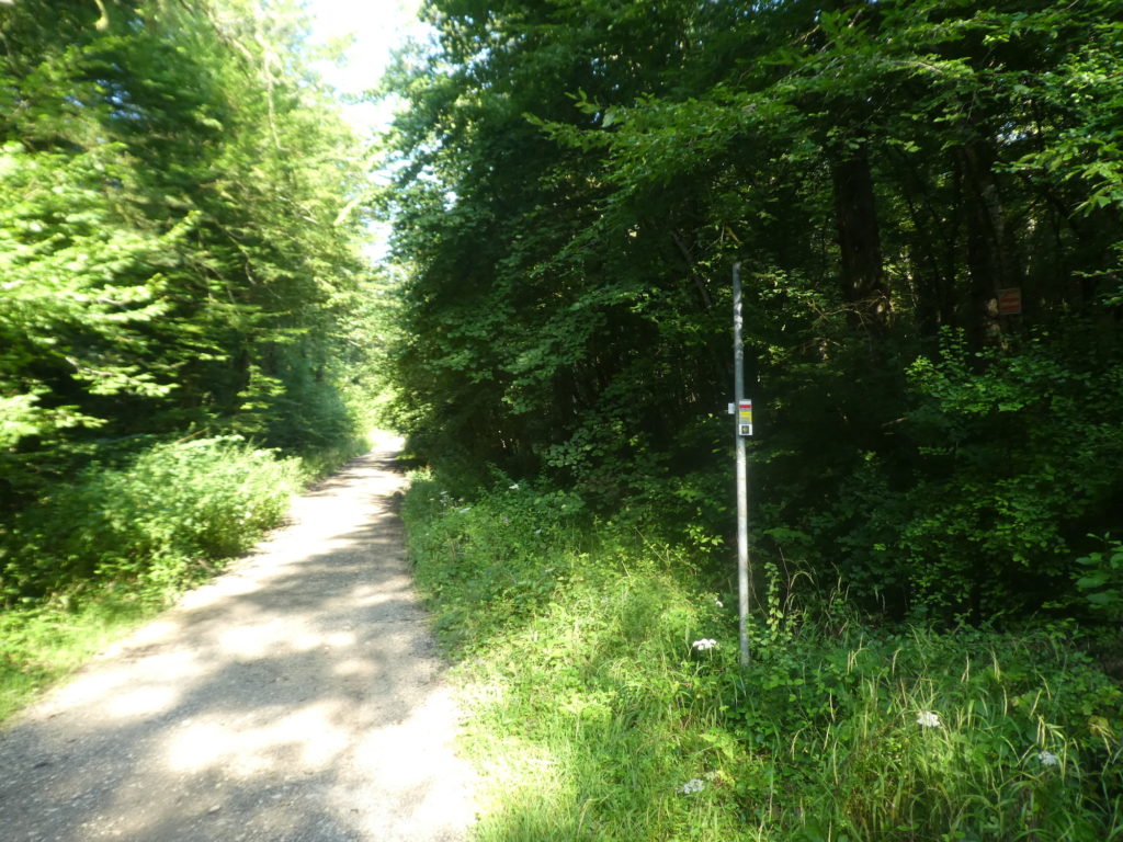 Depuis ce plateau forestier, le chemin redescend, cette fois sur un large chemin empierré. La pente est franche, et la descente se fait à vive allure dans les sous-bois. |