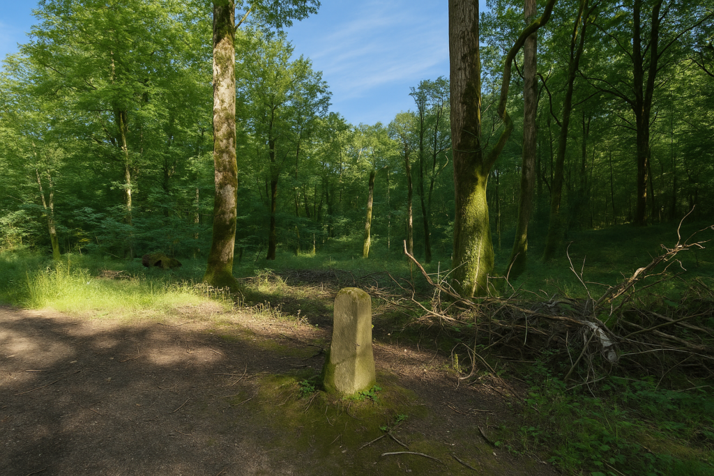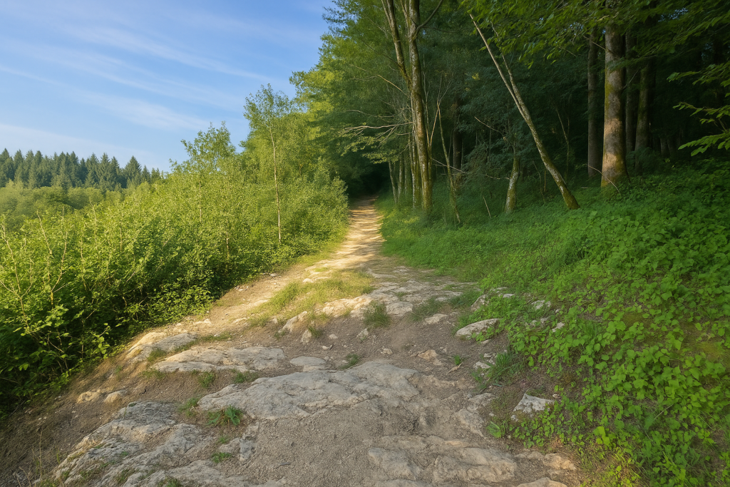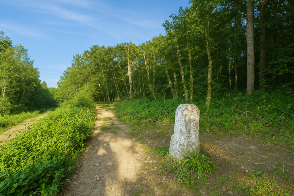 Mais bientôt, le chemin change de structure. Vous entrez dans un tronçon bien particulier : celui du “Chemin des bornes de Montbéliard“. Ici, au bord du chemin, vous apercevrez d’anciennes bornes de pierre, muettes mais toujours debout, témoins d’un passé frontalier. Le chemin peut devenir boueux, même sans pluie récente. Il est creusé par le temps, par les pas et par les ruissellements. |