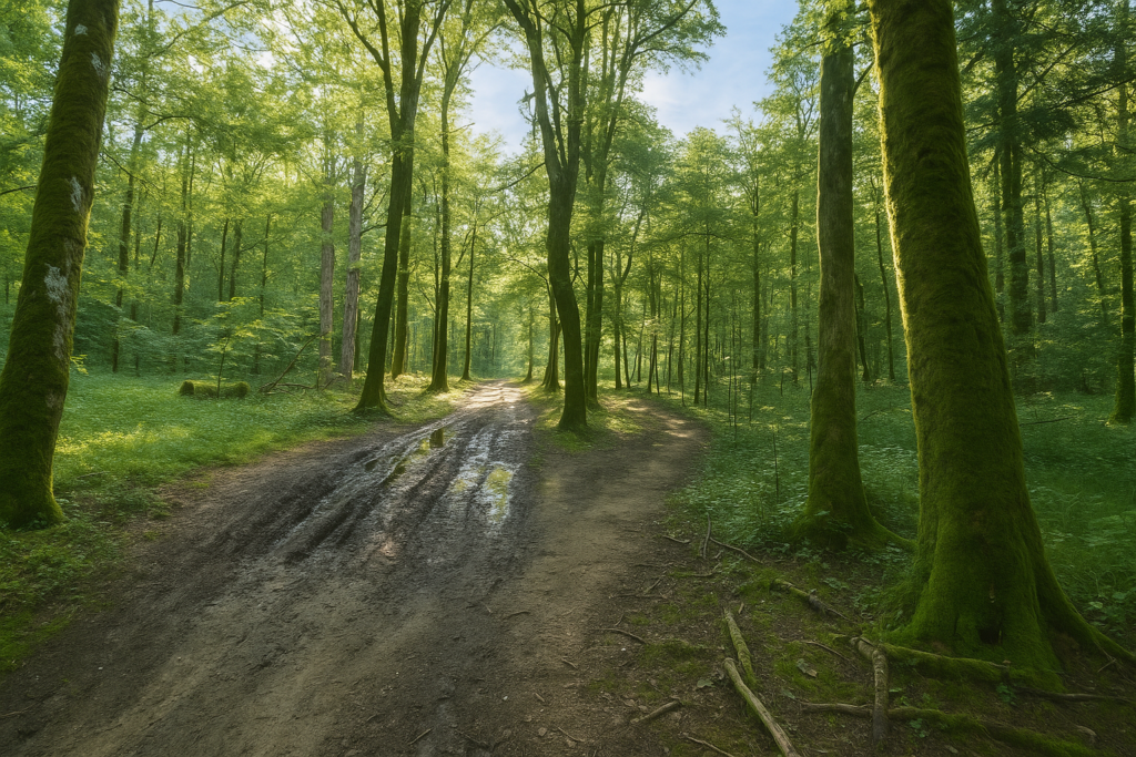 Et voici que la forêt change à nouveau de ton. Elle devient belle, accueillante, presque tendre. Une grâce nouvelle émane des arbres. Pour la première fois, on aperçoit des épicéas perdus parmi les hêtres. Ils se dressent comme des visiteurs discrets, mêlant leurs aiguilles sombres au feuillage clair. C’est une forêt mixte, plus vivante, plus équilibrée. La glaise se fait traîtresse. Les flaques surgissent sans prévenir, épaisses et piégeuses. Mais les promeneurs, rusés, ont déjà tracé mille petits sentiers d’évitement. Ils serpentent en bordure, grimpent sur les côtés, s’écartent juste ce qu’il faut. Une toile de chemins tissée par les semelles prudentes. |