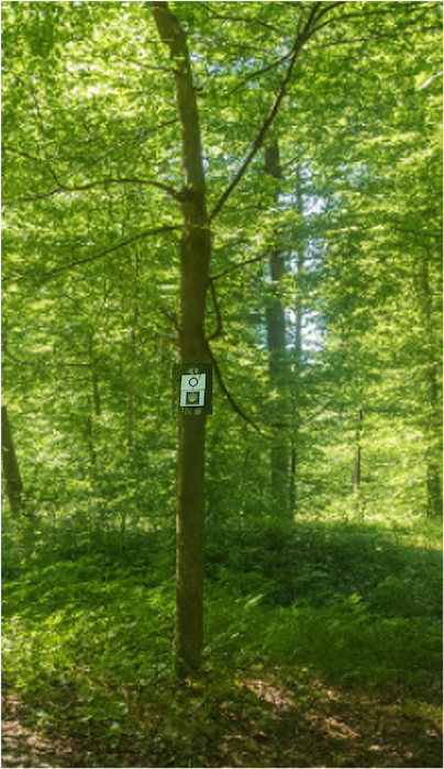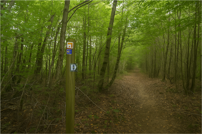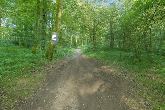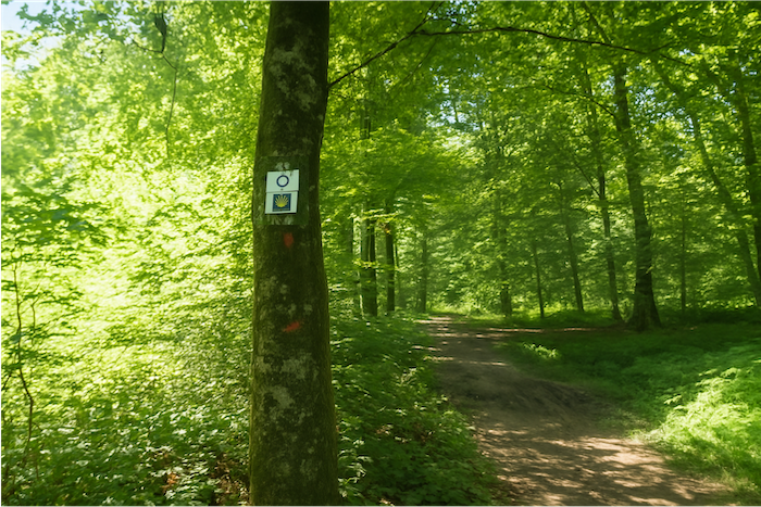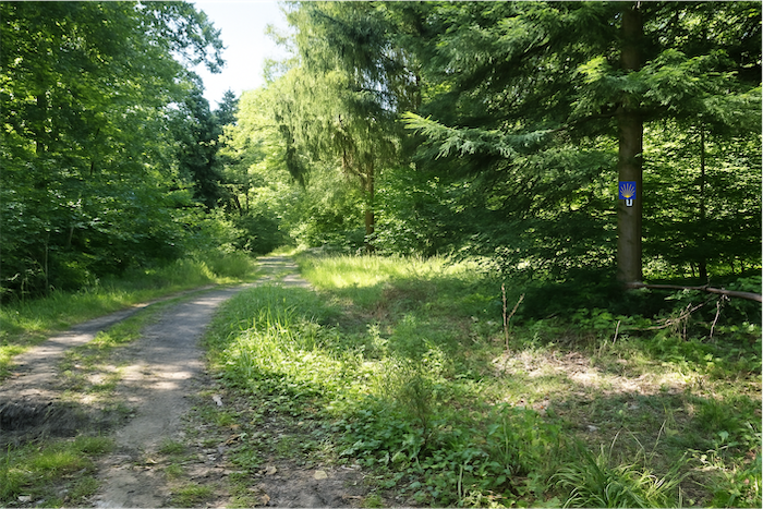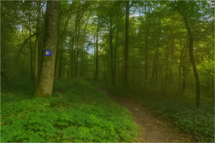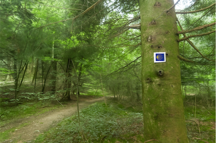 Mais à peine le calme retrouvé, voici que la coquille, fidèle compagne du pèlerin, s’évanouit comme par magie. À sa place, c’est un cercle bleu qui surgit, discret mais tenace. On a perdu le cercle jaune pour un cercle bleu ! On se penche, perplexe. Alors on ressort le guide, on relit, on tente de comprendre. “Le sentier débouche sur un large chemin empierré. Quittez alors le balisage rectangle vert en tournant à gauche. Après 160 mètres, virez à gauche (balisage anneau bleu) pour un chemin plus ou moins marqué qui se poursuit ouest en sinuant légèrement.” Hélas, point de rectangle vert en vue. Sans doute ont-ils été avalés par cette forêt luxuriante, cette chlorophylle ruisselante qui engloutit tout. En revanche, le cercle bleu, lui, est bien là. Peut-être, alors, que malgré tout, nous sommes sur le bon chemin ? |