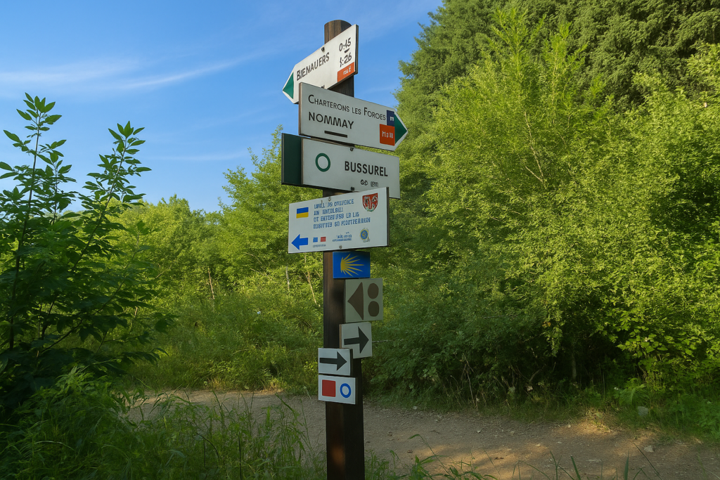 Et c’est là que se dresse un panneau, humble mais capital : changement de cap ! Le GR et le Chemin de Compostelle, ici, modifient leur tracé. Autrefois, le parcours se dirigeait vers Nommay. Ce n’est plus le cas. Désormais, le parcours préfère serpenter entre les étangs, longeant la beauté naturelle plutôt que les axes bétonnés. Un petit détail à noter : si vous possédez encore une ancienne édition du guide des chemins de Franche-Comté ou de Bourgogne, le changement de direction n’y est peut-être pas encore indiqué. Il faudra suivre l’instinct, ou plutôt les coquilles, toujours fidèles sentinelles. Le nouveau guide n’est guère plus précis sur la marche à suivre aujourd’hui. |