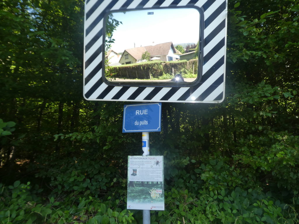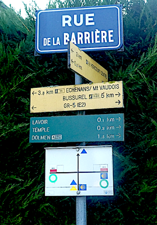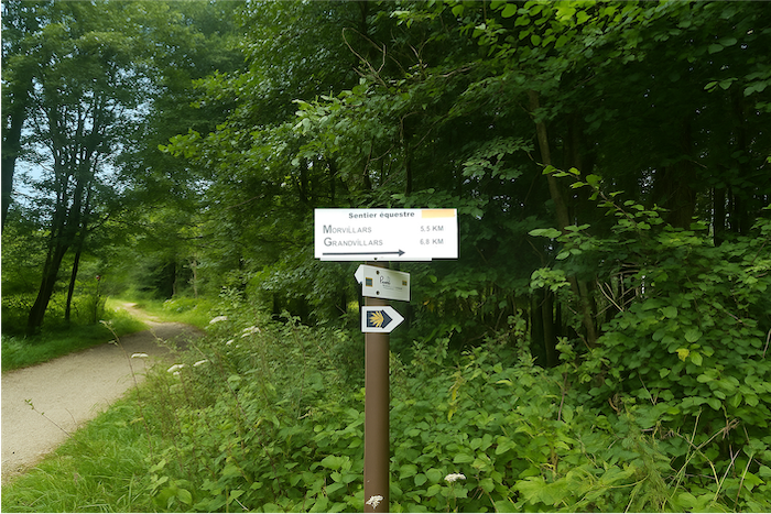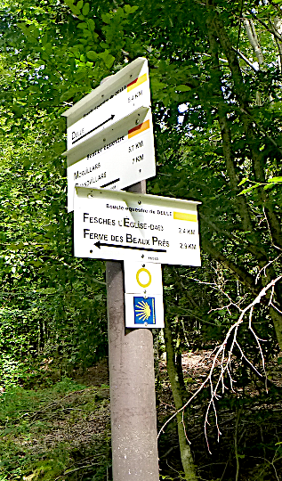 Un panneau de direction vous y attend. Farfelu. Comme c’est souvent le cas en Franche-Comté, vous y trouverez des triangles, des cercles, des couleurs sans légende, parfois une coquille. Deux directions de Compostelle sont indiquées ici. L’une suit le GR5, l’autre semble partir on ne sait trop où. Mais où est la direction d’Héricourt ? Mystère.