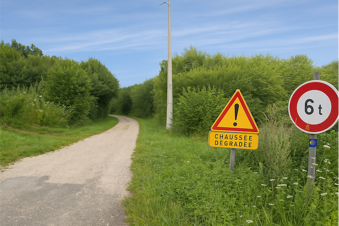 Le parcours emprunte alors une petite route goudronnée, modeste mais régulière, avant de bifurquer sur la gauche vers une voie de terre battue. |