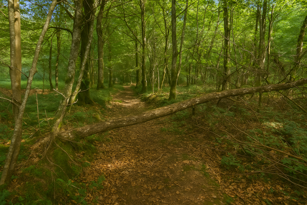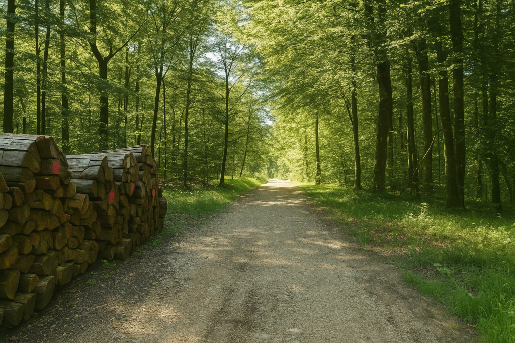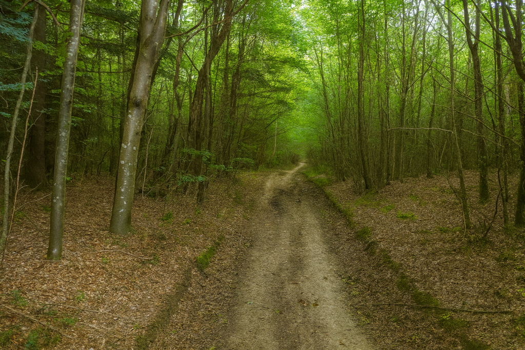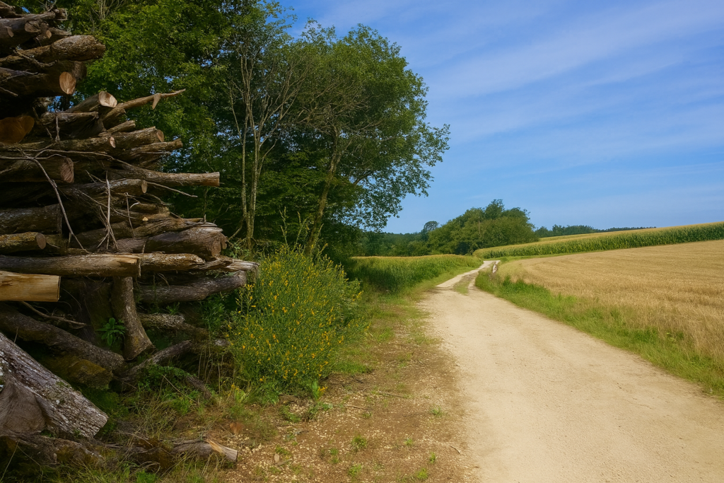 Peu après, le chemin, las de serpenter, se redresse et s’étire en ligne droite. Il longe désormais les tas de bois empilés par les bûcherons, preuves que l’homme, ici, travaille encore la forêt, la façonne, la traverse sans trop la troubler. |