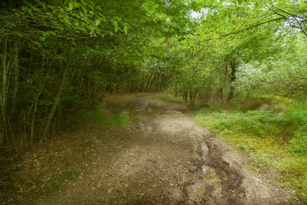 Depuis la déchetterie, la route s’enfonce dans un petit sous-bois, humide, tranquille, tapissé de feuilles. L’ombre y est profonde, ponctuée de rais de lumière. |