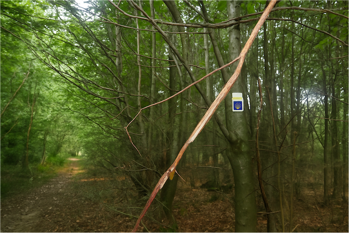 Dans le bois, le signalement du GR est toujours signalé, bien que la coquille de Compostelle soit toujours fausse et mal orientée. Mais, c’est tout droit, sans importance. |
