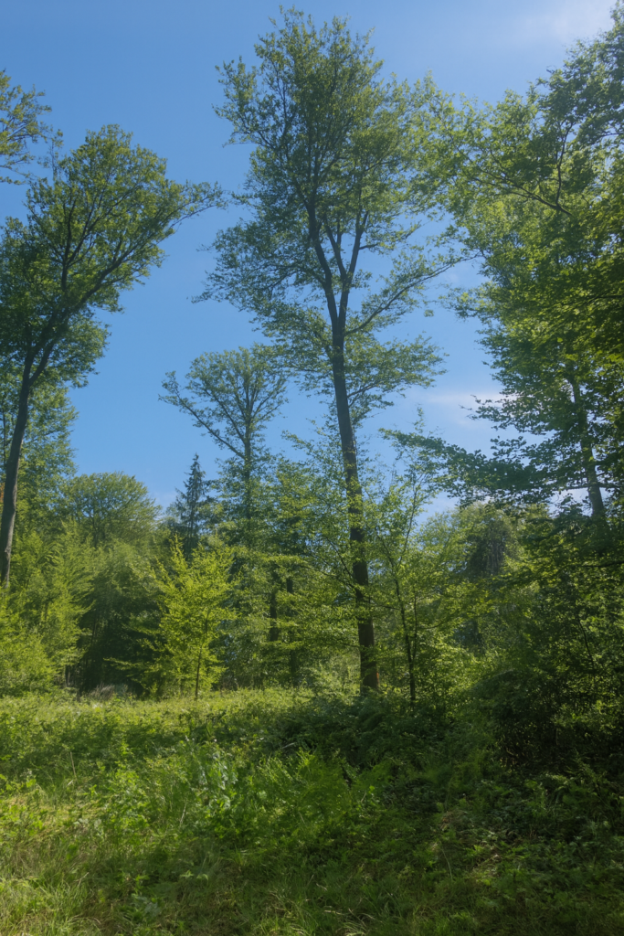 Les hêtres, eux, veillent, silencieux et impassibles. Ils sont droits comme des baguettes de chef d’orchestre, rigides, réguliers, un peu sévères. Quelques rares frênes les accompagnent, timides figurants dans cette austère scénographie. Il faut bien le dire : cette forêt n’a rien de séduisant. Elle est fonctionnelle, disciplinée, presque militaire. |