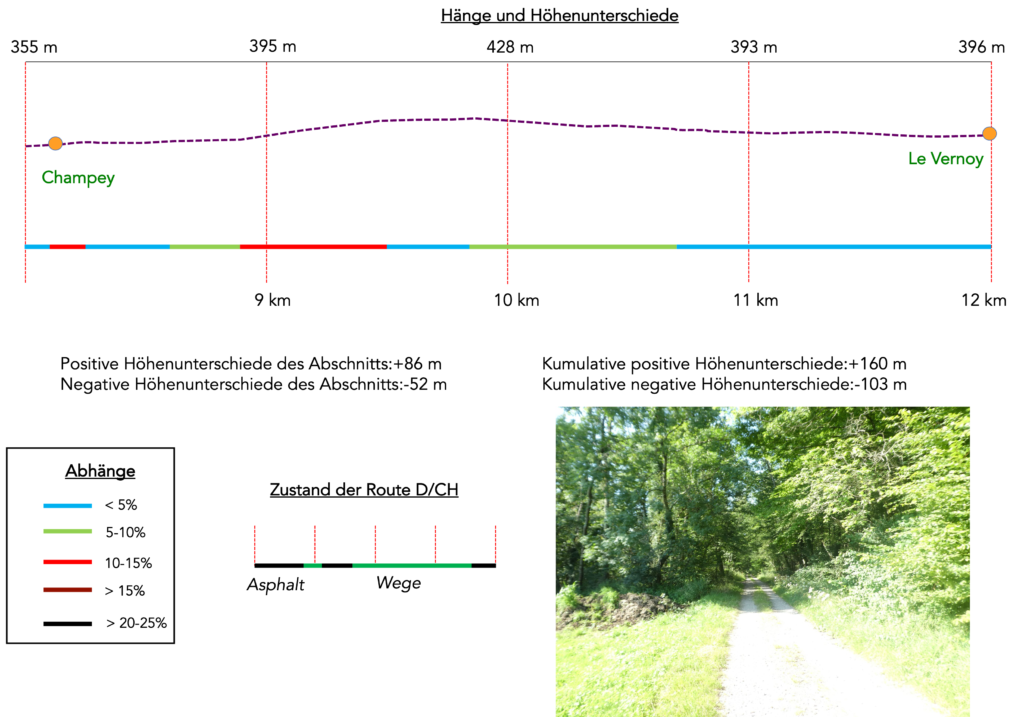 Schwierigkeitsgrad: Die Höhenunterschiede der heutigen Etappe (+198 Meter / −146 Meter) sind sehr gering. Es gibt nur wenige etwas stärkere Anstiege in der Umgebung von Champey, sie sind jedoch recht kurz. Allerdings sind die Wege stellenweise sehr steinig.