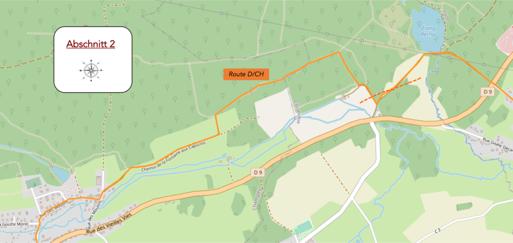 An dieser Stelle stößt die Verbindung aus Basel zu der des GR5, der nach Norden weitergezogen ist. Von hier an folgen Sie der Route der Deutschland  und der Schweiz, der Route D/CH. Die Komplexität dieser Strecken, die sich kreuzen, verbinden und doppeln, lässt die Pilger auf dem Jakobsweg oft ratlos und manchmal auch besorgt aus Angst vor Irrtümern zurück.