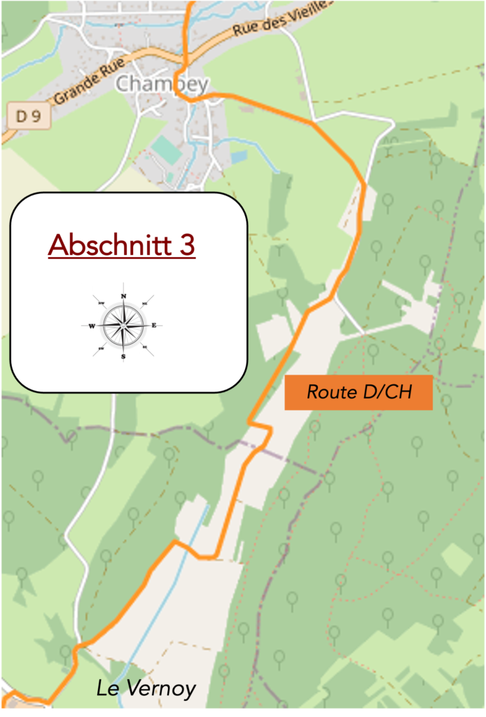 Le Vernoy ist nur noch wenige Schritte entfernt. Man ahnt es ganz nah, verborgen hinter Hecken und Feldern. Doch die Strecke betritt es nicht. Sie umfährt es, sie meidet es. Das Dorf bleibt am Rand, als gehöre es zu einer anderen Zeit und zu einer anderen Logik. Es ist ein Bauerndorf, tief in seiner Erde verwurzelt, und die Strecke scheint diese Einsamkeit und diese ländliche Eigenständigkeit respektieren zu wollen.