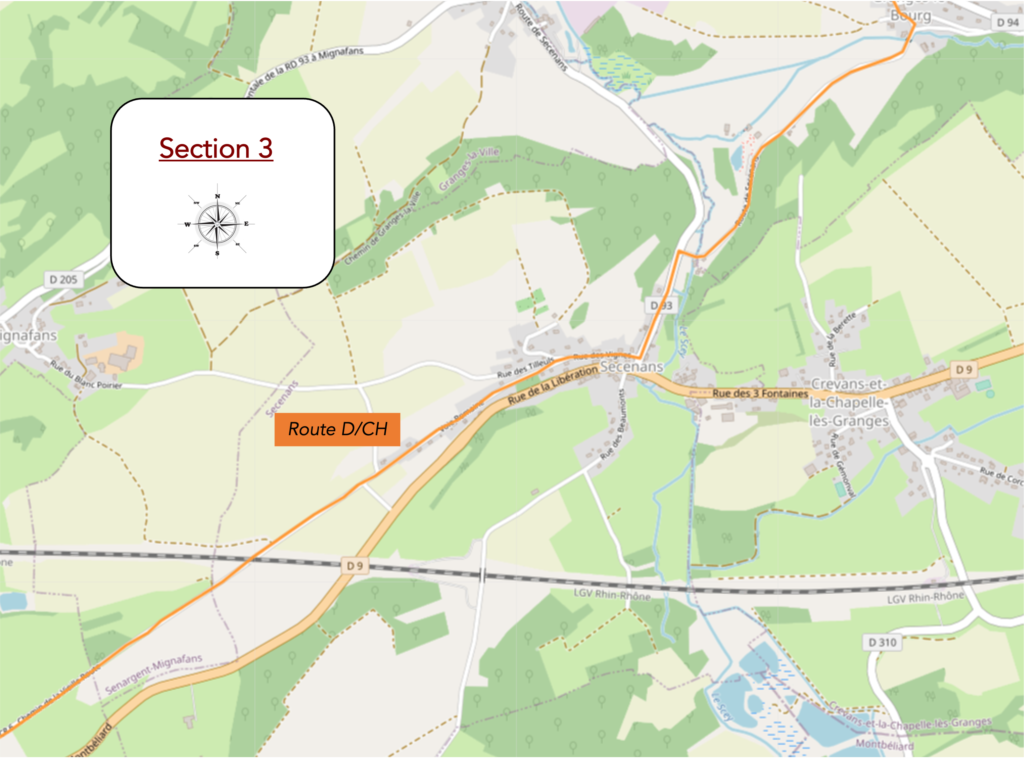 | The road to Saulnot passes again beneath the high-speed line, in a narrow cutting of asphalt that brushes against modernity without blending into it. | |