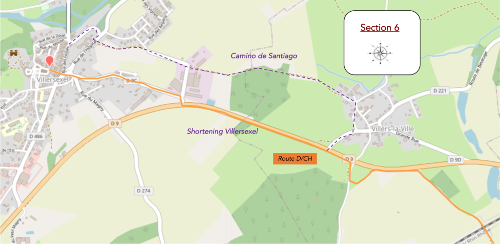 In this precise case, the waymarked route crosses the D9 a little farther on, goes through Villers-la-Ville, then descends toward the outskirts of Villersexel, close to the Ognon river. The simplest option here is to choose the dirt path along the departmental road. It takes you directly to Villersexel without making the detour through Villers-la-Ville. It is very close. Moreover, the German pilgrims we had met earlier, the very ones with their calm donkeys and alert dogs, split here, some heading toward Villers-la-Ville, others following the dirt path. Two options, two temperaments, some guided by efficiency, others by the call of higher ground. As for us, we followed the simpler, more direct variant.