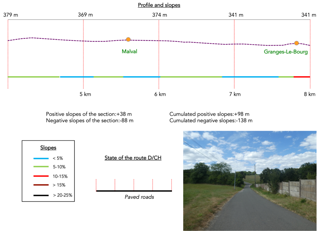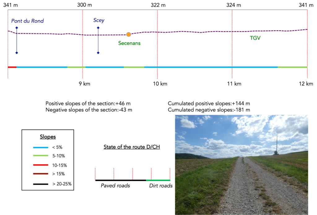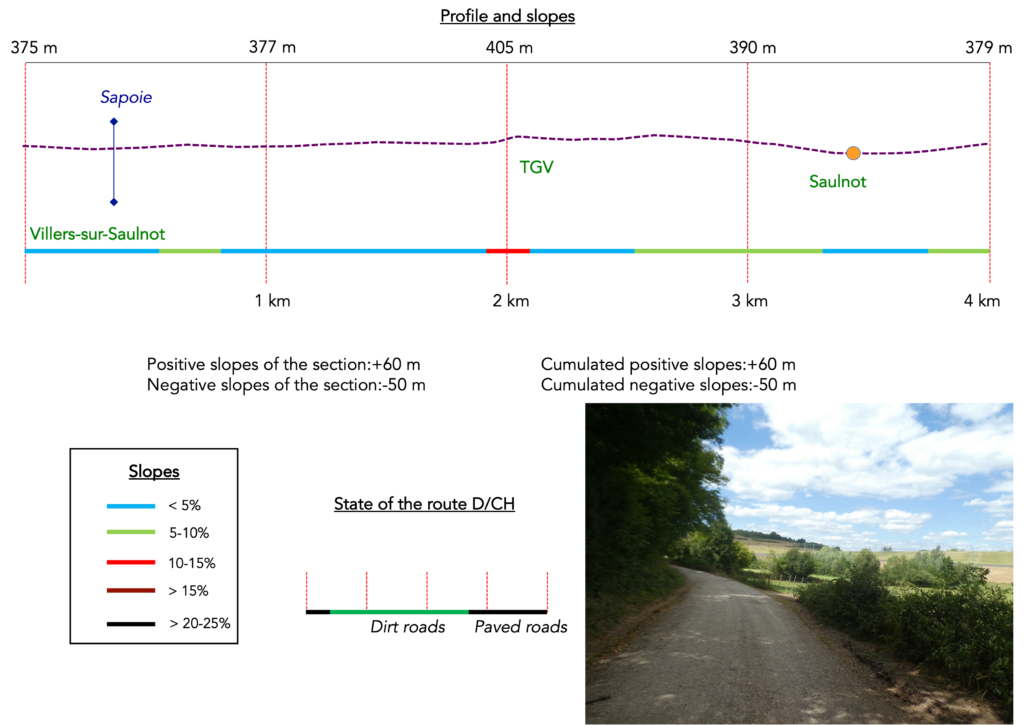 Sometimes, for reasons of logistics or housing possibilities, these stages mix routes operated on different days, having passed several times on these routes. From then on, the skies, the rain, or the seasons can vary. But, generally this is not the case, and in fact this does not change the description of the course. It is very difficult to specify with certainty the incline of the slopes, whatever the system you use. For those seeking « true elevations » and enthusiasts of genuine altimetric challenges, carefully review the information on mileage at the beginning of the guide.