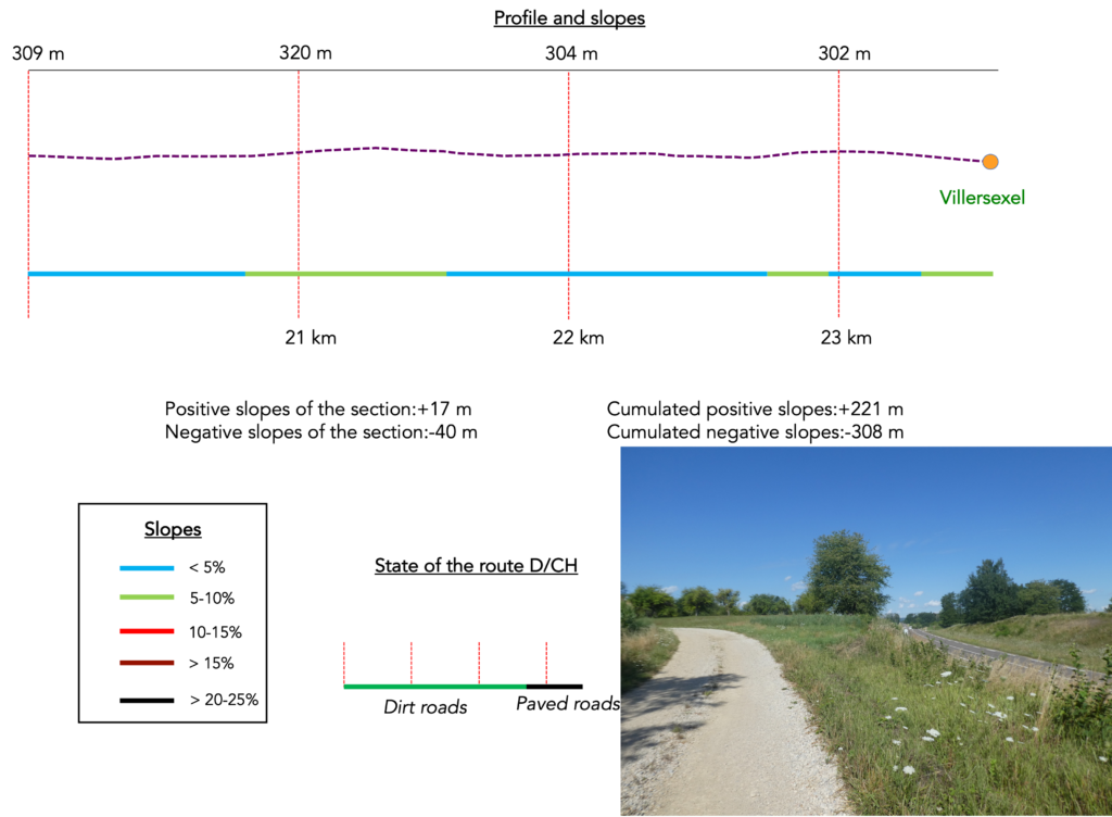 But this vast plan has a price, and not only in euros. The staggering cost of the project led decision-makers, driven by a cold pragmatism, to prioritize construction of the eastern branch, the most profitable one. It serves as the backbone, the spinal column, while waiting for the rest of the skeleton to be assembled. It must be said that the prospects for economic cooperation with the major industrial and technological hubs of Germany and Switzerland are more than attractive. As for tourism… that is another matter. Who would come here by train, and to go where? Up the line, you are still 35 kilometers from Dijon, 20 kilometers from Dole, far from any lively center. The TGV does stop at Besançon and Montbéliard, but these are not central stations: the traveller must finish the journey on foot, by taxi, or on horseback, for lack of a tram or bus. One would think that the engineers of the high-speed lines, perched in their towers in Paris, had never set foot on the land they crisscross with their authoritarian routes . This project, like an unfinished promise, regularly resurfaces. Its first phase was completed in 2011. Since then, the second has been announced, postponed, redrawn: it is supposed to add fifteen kilometers toward Dijon to the west, and thirty-five kilometers toward Lutterbach to the east, on the outskirts of Mulhouse. The construction start date had been set for 2014. Postponed. Reassessed. In 2019, the Minister of Transport, Élisabeth Borne, solemnly promised: the line will be completed by 2028. One smiles. There are promises that fade away with the drizzle. In the meantime, a few regional trains still provide connections between Belfort, Vesoul, Montbéliard, Dole, and Besançon. They do exist, of course. But they remain invisible to the walker: never does a railway line break the horizon of your hike. And with good reason. The French designers of the Way of Compostela deliberately avoided towns, villages, places of transit. They drew solitary, rural, intimate lines of escape. Their creed seems to be that of the integrity of the path — a single-breath pilgrimage, without interruption, without turning back. But the walkers of the 21st century are not those of the Middle Ages. Many of them divide their journey into sections, come back, start again. And for them, returning to the starting point becomes a puzzle, a challenge sometimes more difficult than the stage itself. One must, after all, pass somewhere, find a way through the furrows of modernity. So today, between two rumblings of TGVs bursting forth like beasts of steel, you will have every opportunity to reflect on this strange railway geography conceived in Paris and applied here, in a countryside that at times seems drained of its soul. And yet, beyond the tracks and the fences, the forests remain, majestic, generous, unaltered. They alone still resist the furrows carved by humankind. How do pilgrims plan their route. Some imagine that it is enough to follow the signposting. But you will discover, to your cost, that the signposting is often inadequate. Others use guides available on the Internet, which are also often too basic. Others prefer GPS, provided they have imported the maps of the region onto their phones. Using this method, if you are an expert in GPS use, you will not get lost, even if the route proposed is sometimes not exactly the same as the one indicated by the shells. You will nevertheless arrive safely at the end of the stage. In this context, the site considered official is the European Route of the Ways of St. James of Compostela, https://camino-europe.eu/. For today’s stage, the map is accurate, but this is not always the case. With a GPS, it is even safer to use the Wikilocs maps that we make available, which describe the current marked route. However, not all pilgrims are experts in this type of walking, which to them distorts the spirit of the path. In that case, you can simply follow us and read along. Every difficult junction along the route has been indicated in order to prevent you from getting lost. Difficulty level: The elevation of the day is very moderate (+221 meters / -308 meters), which is generally true in Haute-Saône. Slopes of more than ten percent are rare, and the route rolls gently throughout the day.