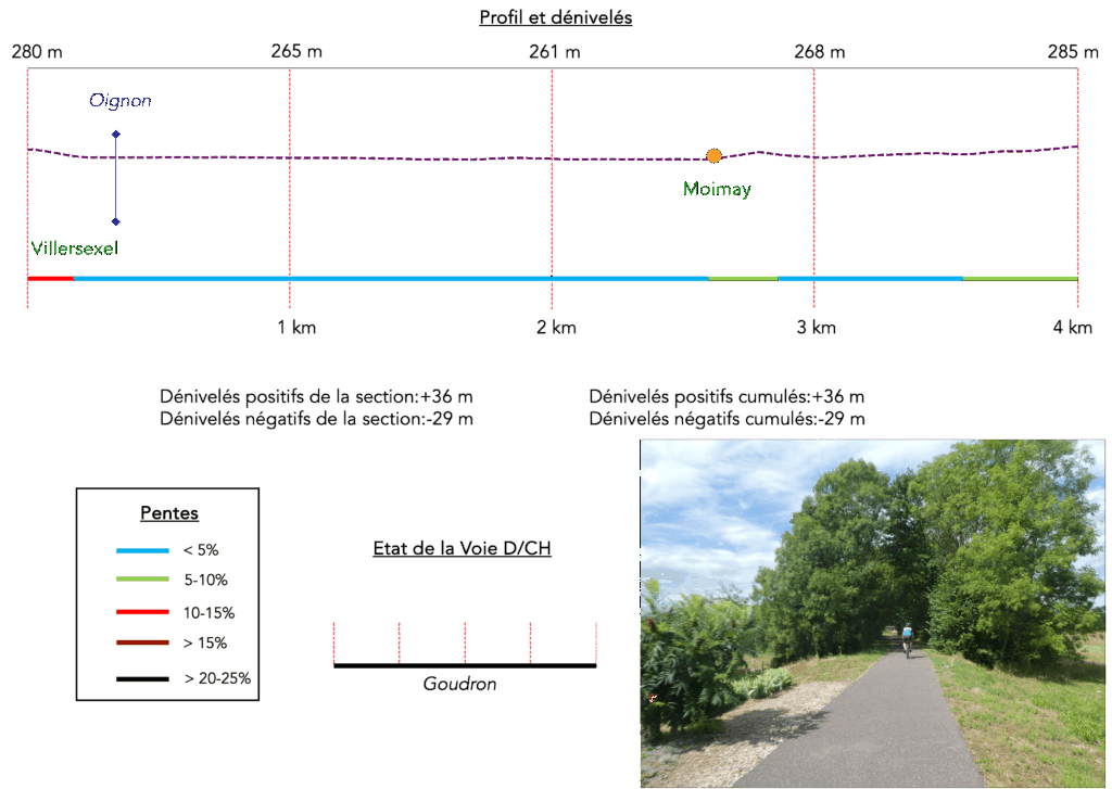 | Plus loin, l’escapade cyclable touche à sa fin à l’entrée du village de Moimay. Le parcours délaisse alors la piste et prend de la hauteur, grimpant doucement dans les ruelles. |