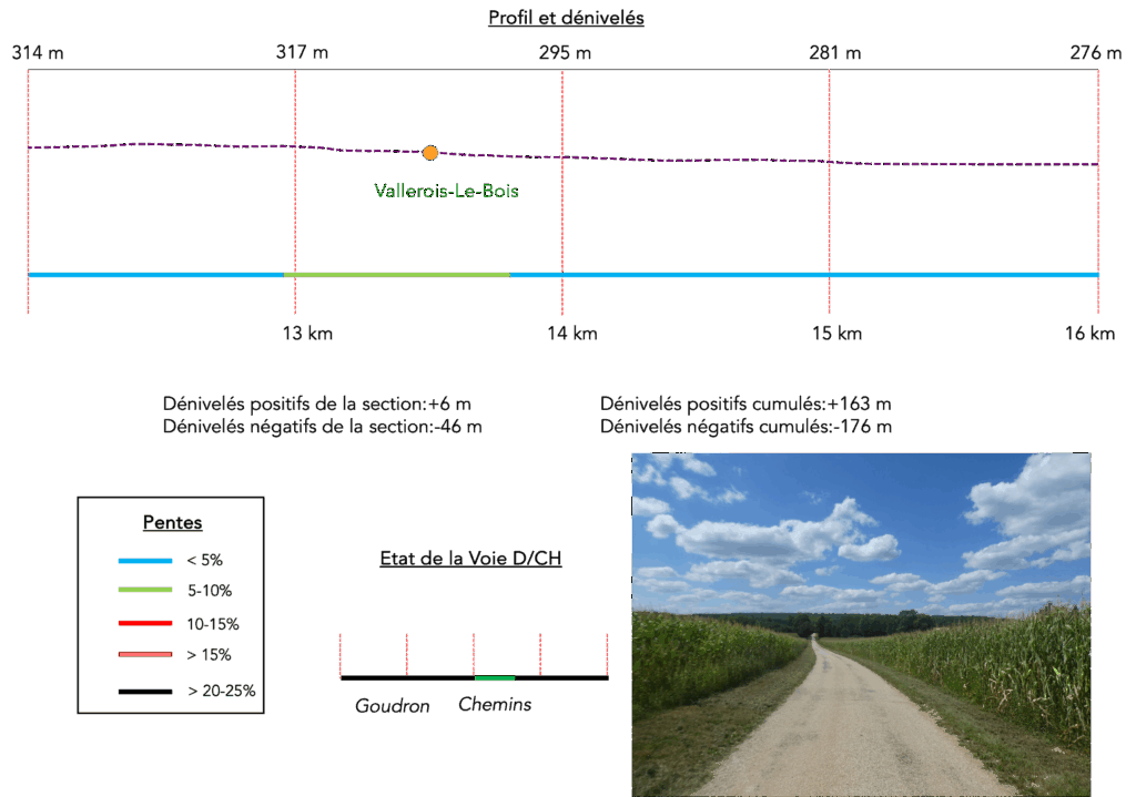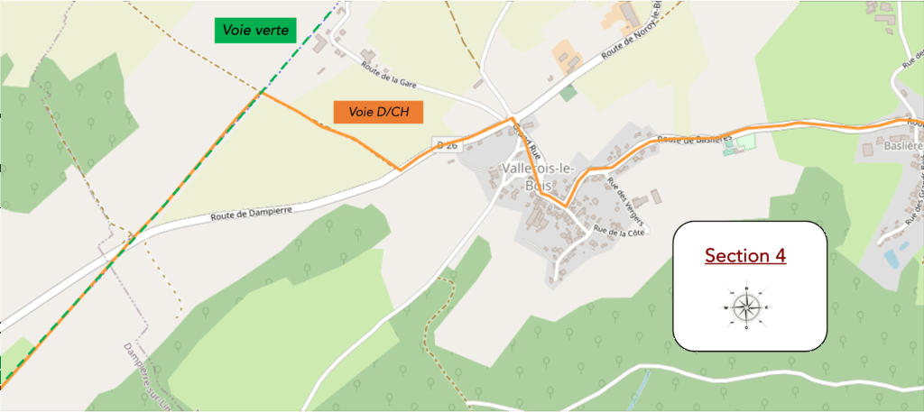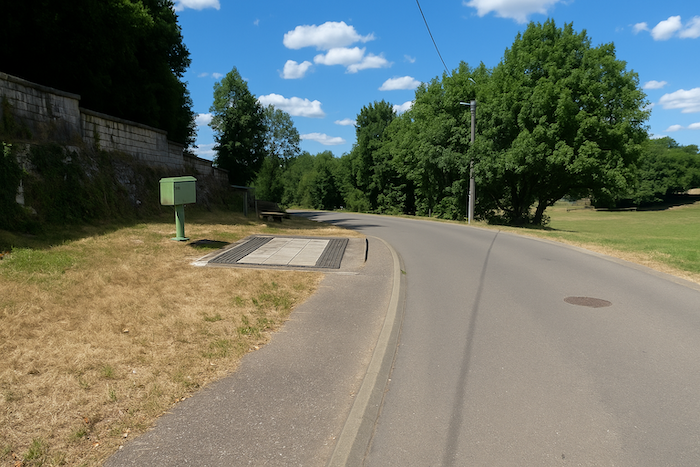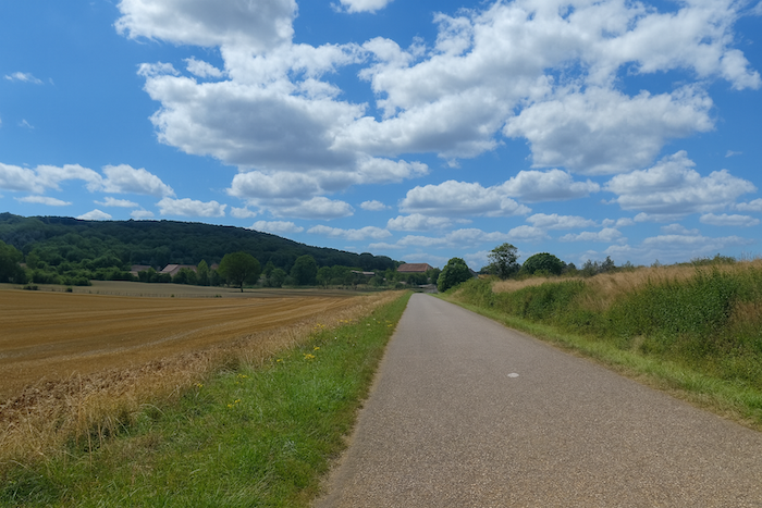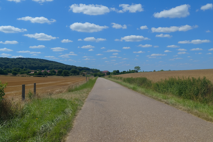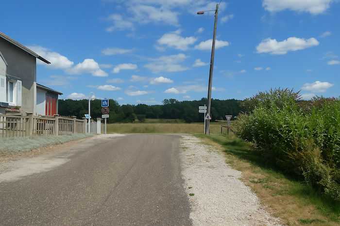 | Au bout d’un kilomètre, la piste cyclable franchit la route de Dampierre, un point de jonction où se croisent le passé et le présent. |