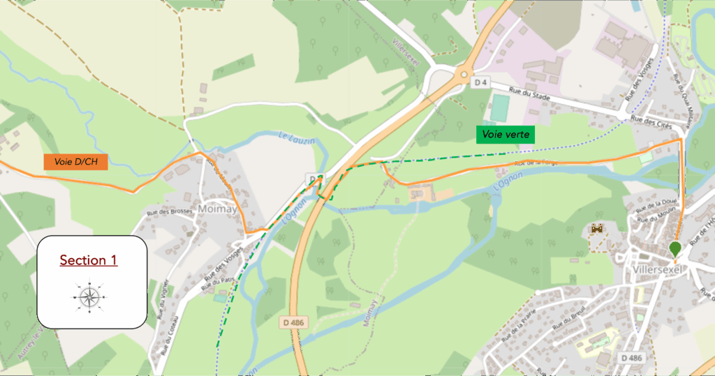 | La piste longe désormais la D486, une artère routière importante reliant les Vosges à la Haute-Saône. Pourtant, malgré la proximité de cette voie animée, on se sent protégé, presque dans une bulle, comme si le trafic n’était qu’une rumeur lointaine dans le silence du paysage. |