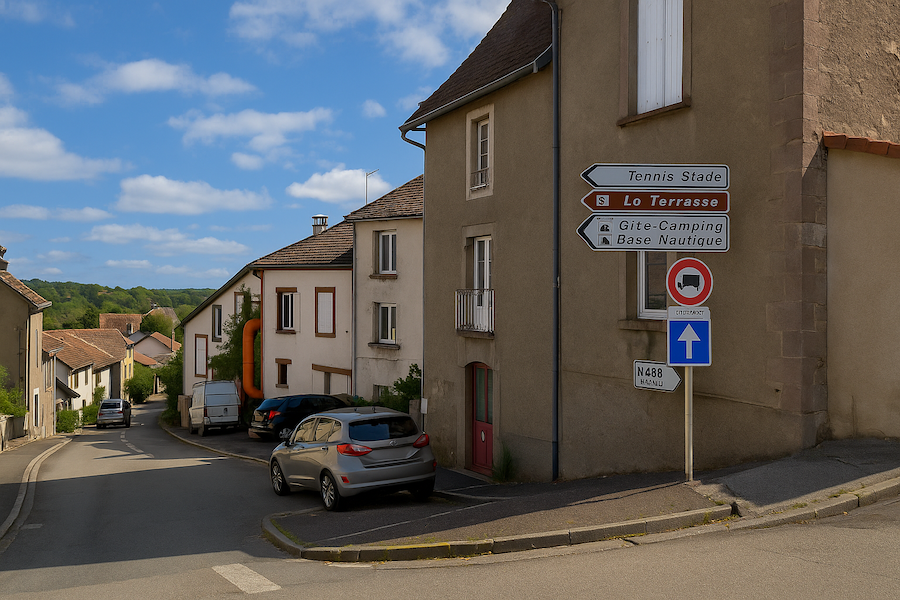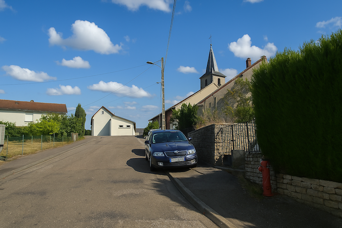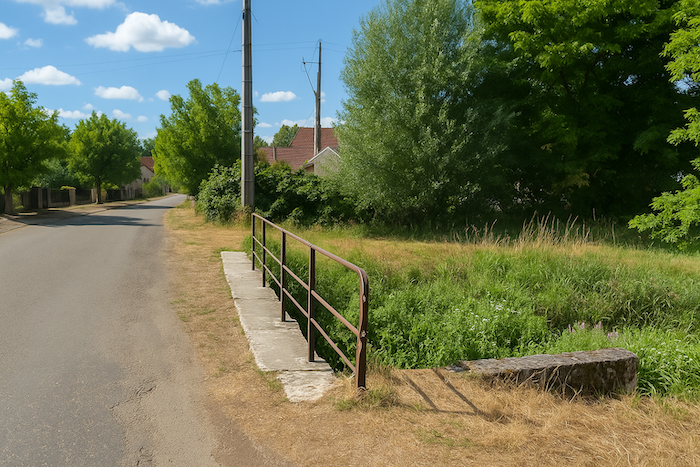 | De cet endroit, le clocher du village se dessine à l’horizon, fièrement dressé vers le ciel. La route traverse encore une fois la Linotte avant de s’engager définitivement dans le village, concluant ce passage entre l’ombre des bois et la lumière des maisons. |