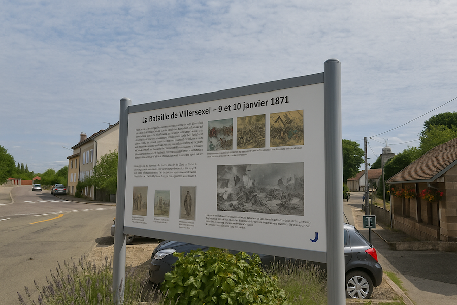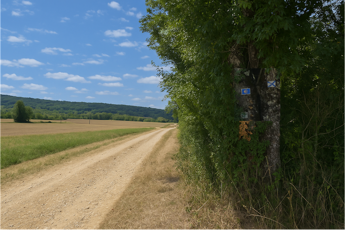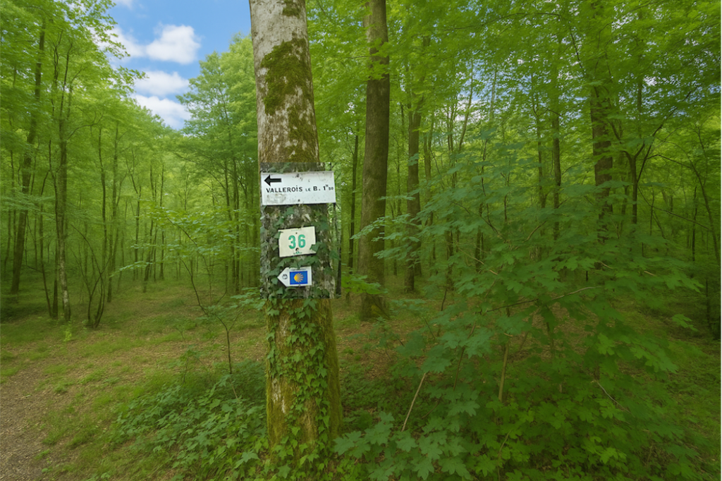 | Vous pénétrez alors dans les Grands Bois, cette vaste forêt où, en 1871, la terre s’imprégna de l’Histoire. Ici, lors de la bataille de Villersexel, Français et Allemands s’affrontèrent dans le tumulte de la guerre franco-prussienne. Les Prussiens occupaient les bois, stratégiquement. Les traces du conflit se sont effacées, mais l’écho des combats résonne encore pour ceux qui savent écouter. Un GR traverse ce lieu, sans doute le GR9, ainsi qu’un autre chemin, balisé d’un cercle vert, comme savent le faire, avec sobriété et finesse, les passionnés de Franche-Comté. Ne vous laissez pas distraire : ce sont bien les coquilles que vous devez suivre. Ce chemin est le vôtre. |