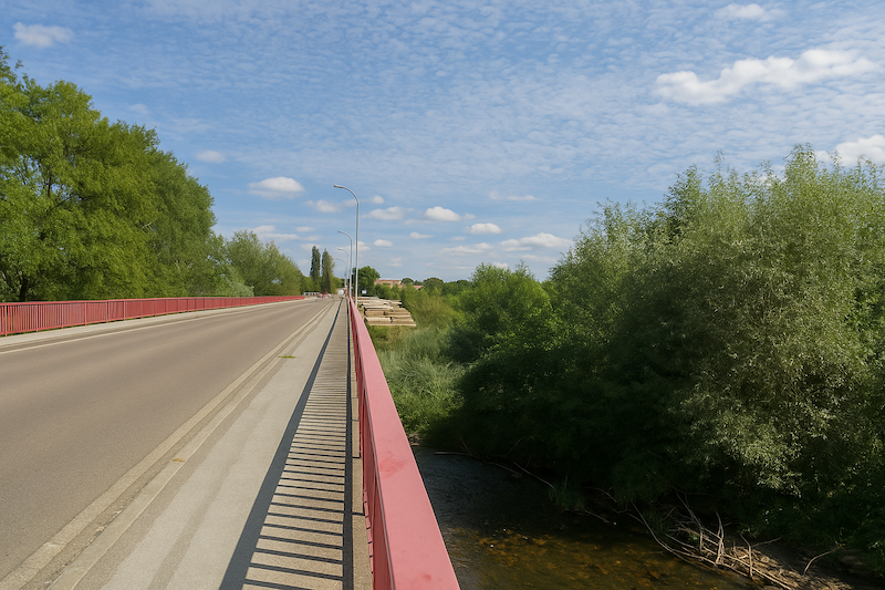 | Ici, la piste semble vouloir s’amuser, ou peut-être ruser. Elle s’engage dans une sorte de gymkhana insolite, enchaînant les virages sur des petits ponts dessinés pour épouser les caprices de l’Oignon. La rivière se faufile comme un serpent endormi sous les ouvrages, traînant son eau lourde et un peu boueuse entre des berges hésitantes. |